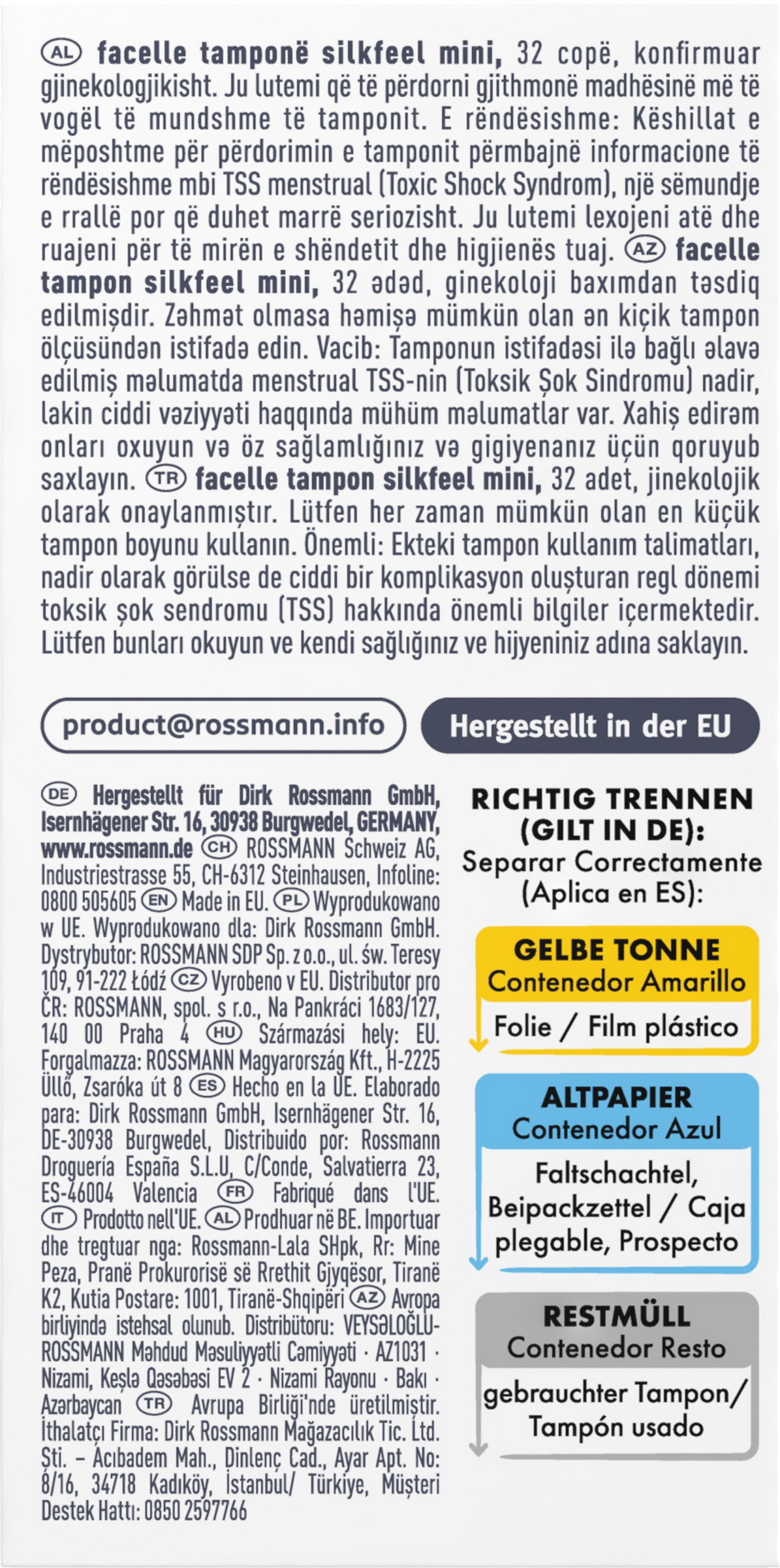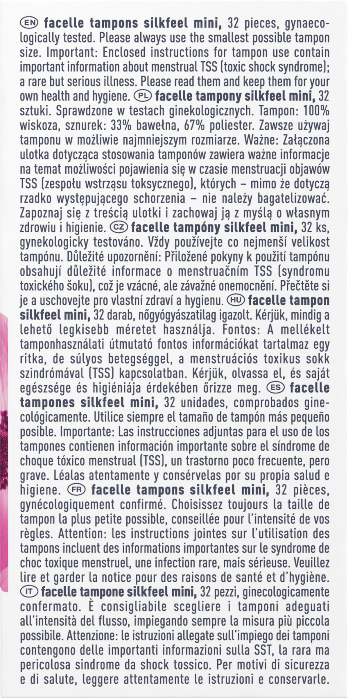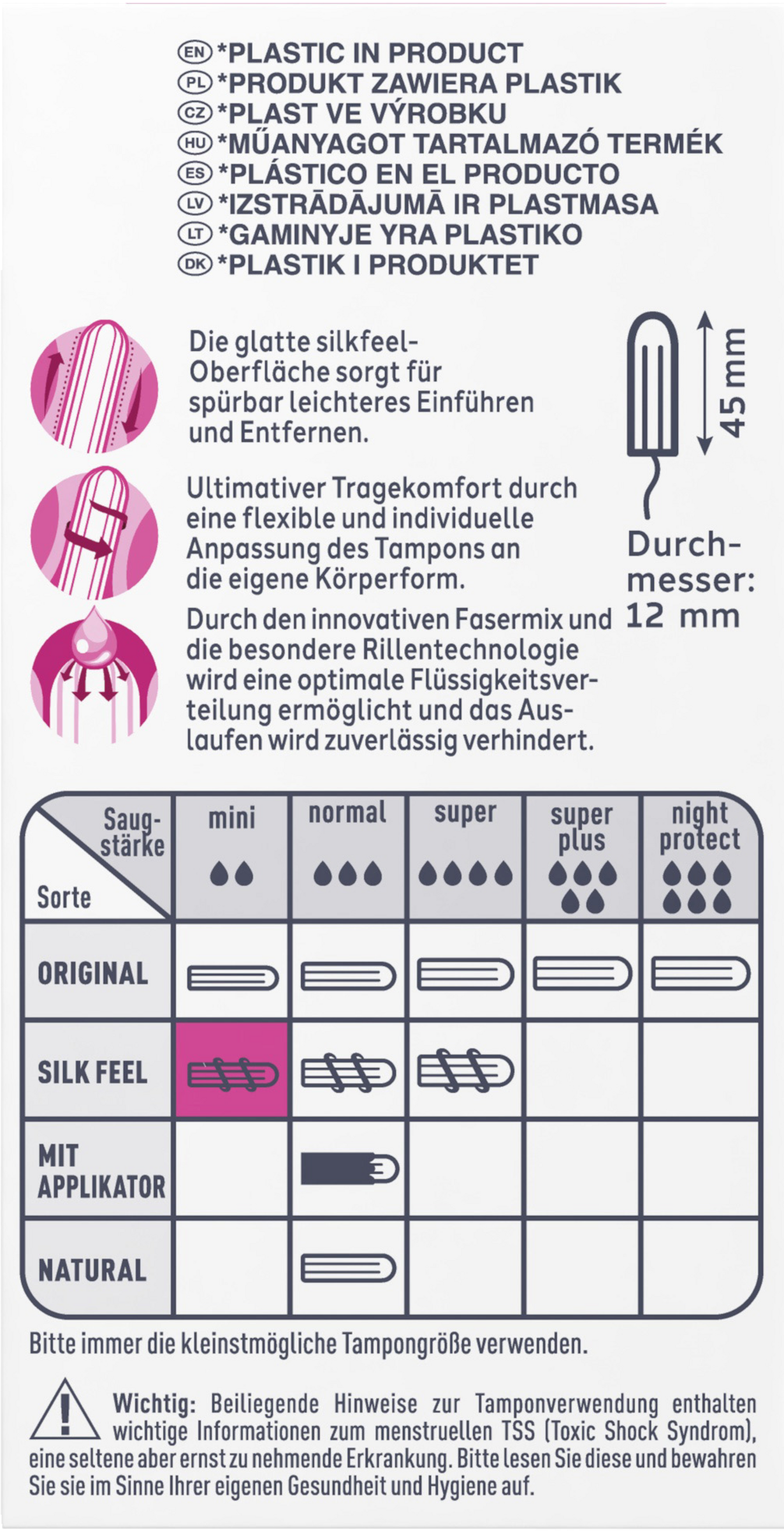 Beiliegende Hinweise zur Tamponverwendung enthalten wichtige Informationen zum menstruellen TSS (Toxic Shock Syndrom), eine seltene aber ernst zu nehmende Erkrankung, die mit Tampons in Verbindung gebracht wird. Bitte lesen Sie diese und bewahren Sie sie auf für Ihre Gesundheit und Hygiene.