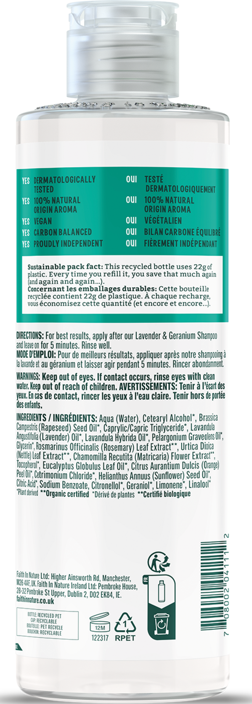 Aqua (Water), Cetearyl Alcohol*, Brassica Campestris (Rapeseed) Seed Oil*, Lavandula Angustifolia (Lavender) Oil*, Lavandula Hybrida Oil*, Pelargonium Graveolens (Geranium) Oil*, Melaleuca Alternifolia (Tea Tree) Leaf Oil*, Parfum (Fragrance)*, Anthocyanins*, Cetrimonium Chloride*, Sodium Benzoate, Potassium Sorbate, Citric Acid*, Citronellol*, Geraniol*, Linalool