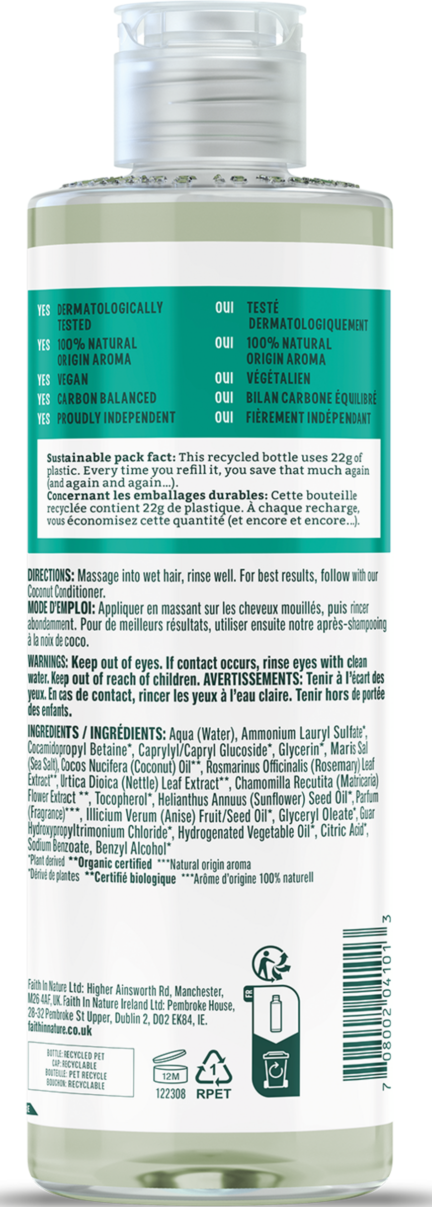 Seit 1974 glaubt Faith in Nature an die Kraft der Natur und daran, diese ökologisch schonend zu nutzen. Die Produkte verwenden wirkungsvolle Inhaltsstoffe von höchster Qualität und natürlichen Ursprungs, die ohne Tierversuche und mit 100% natürlichem Duft hergestellt werden. Das Shampoo enthält Bio-Kokosöl als natürlichen Feuchtigkeitsspender sowie tropische Aromen.