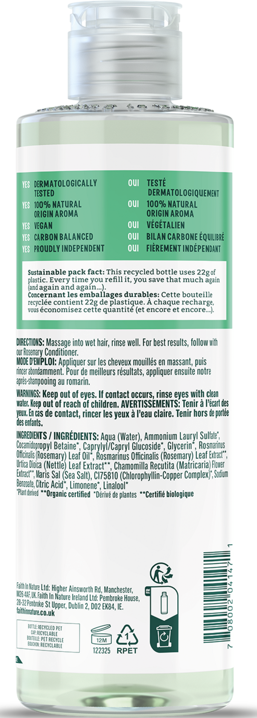 Dieses Shampoo beinhaltet kostbares Bio-Rosmarin, welches für seine aufbauende Wirkung bekannt ist und den Haarwuchs beschleunigt, während gleichzeitig auch die Kopfhaut gepflegt wird. Rosmarin bringt fettiges Haar in Gleichgewicht.