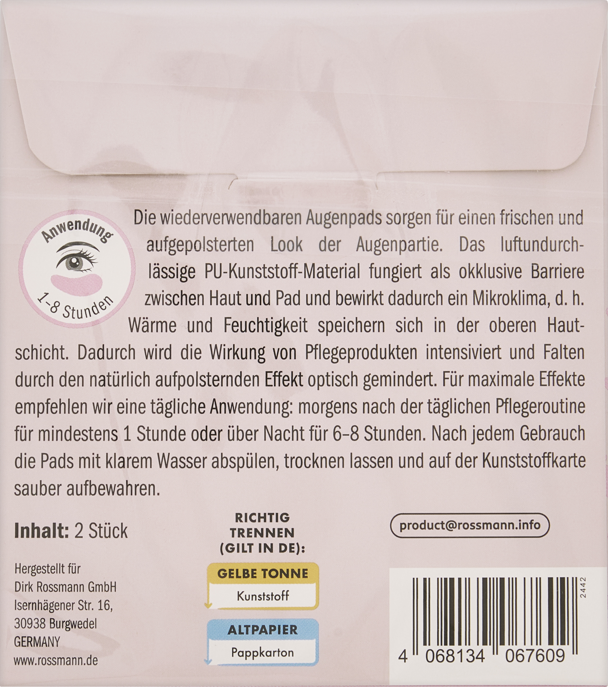 Die wiederverwendbaren Augenpads sorgen für einen frischen und aufgepolsterten Look der Augenpartie. Das luftundurchlässige PU-Kunststoff-Material fungiert als okklusive Barriere zwischen Haut und Pad und bewirkt dadurch ein Mikroklima, d.h. Wärme und Feuchtigkeit speichern sich in der oberen Hautschicht. Dadurch wird die Wirkung von Pflegeprodukten intensiviert und Falten durch den natürlich aufpolsternden Effekt optisch gemindert.