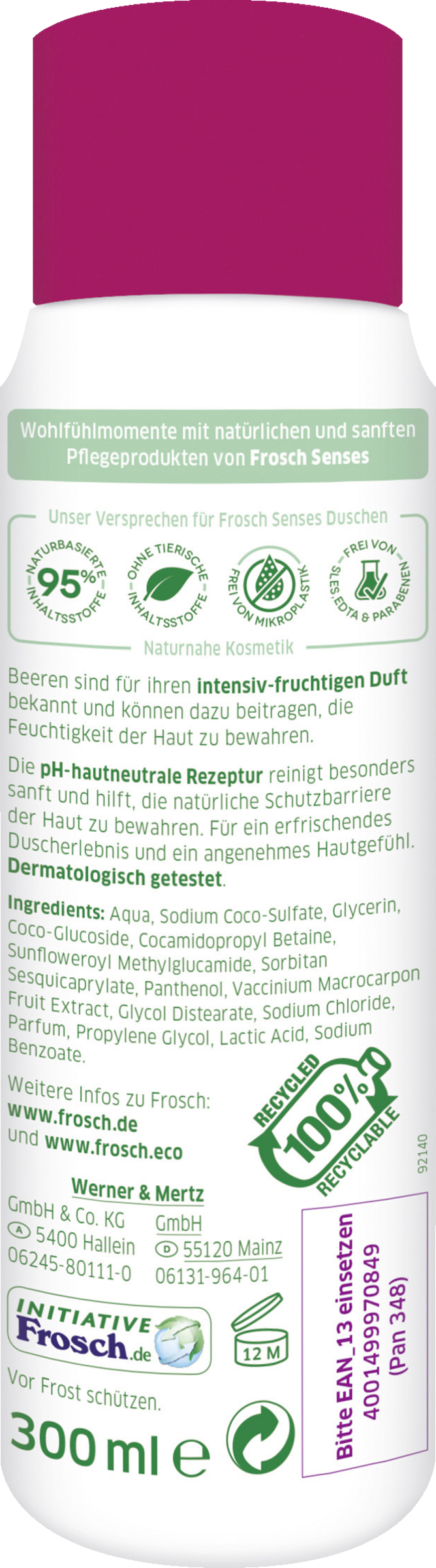 Die Frosch Senses Creme-Dusche Winterbeeren reinigt und pflegt die Haut besonders schonend. Die sensitive und pH-hautneutrale Pflegeformel mit Cranberry-Extrakt hinterlässt ein angenehm zartes Hautgefühl im Winter. Die Rezeptur mit ausgewählten Inhaltsstoffen Naturnaher Kosmetik ist frei von SLES, Mikroplastik, EDTA, Parabenen, Farbstoffen und tierischen Inhaltsstoffen. Die Hautverträglichkeit ist dermatologisch bestätigt. Die Flasche besteht zu 100% aus Altplastik aus dem Gelben Sack/Tonne und ist zu 100% recycelbar.
