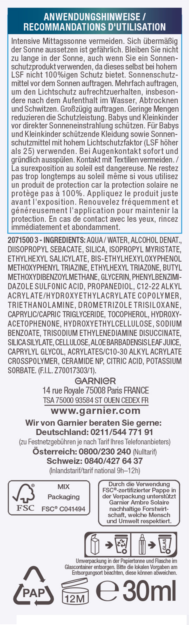 AQUA / WATER, ALCOHOL DENAT., DIISOPROPYL SEBACATE, SILICA, ISOPROPYL MYRISTATE, ETHYLHEXYL SALICYLATE, BIS-ETHYLHEXYLOXYPHENOL METHOXYPHENYL TRIAZINE, ETHYLHEXYL TRIAZONE, BUTYL METHOXYDIBENZOYLMETHANE, GLYCERIN, PHENYLBENZIMIDAZOLE SULFONIC ACID, PROPANEDIOL, C12-22 ALKYL ACRYLATE/HYDROXYETHYLACRYLATE COPOLYMER, TRIETHANOLAMINE, DROMETRIZOLE TRISILOXANE, CAPRYLIC/CAPRIC TRIGLYCERIDE, TOCOPHEROL, HYDROXYACETOPHENONE, HYDROXYETHYLCELLULOSE, SODIUM BENZOATE, TRISODIUM ETHYLENEDIAMINE DISUCCINATE, SILICA SILYLATE, CELLULOSE, ALOE BARBADENSIS LEAF JUICE, CAPRYLYL GLYCOL, ACRYLATES/C10-30 ALKYL ACRYLATE CROSSPOLYMER, CERAMIDE NP, CITRIC ACID, POTASSIUM SORBATE (F.I.L. Z70017303/1).