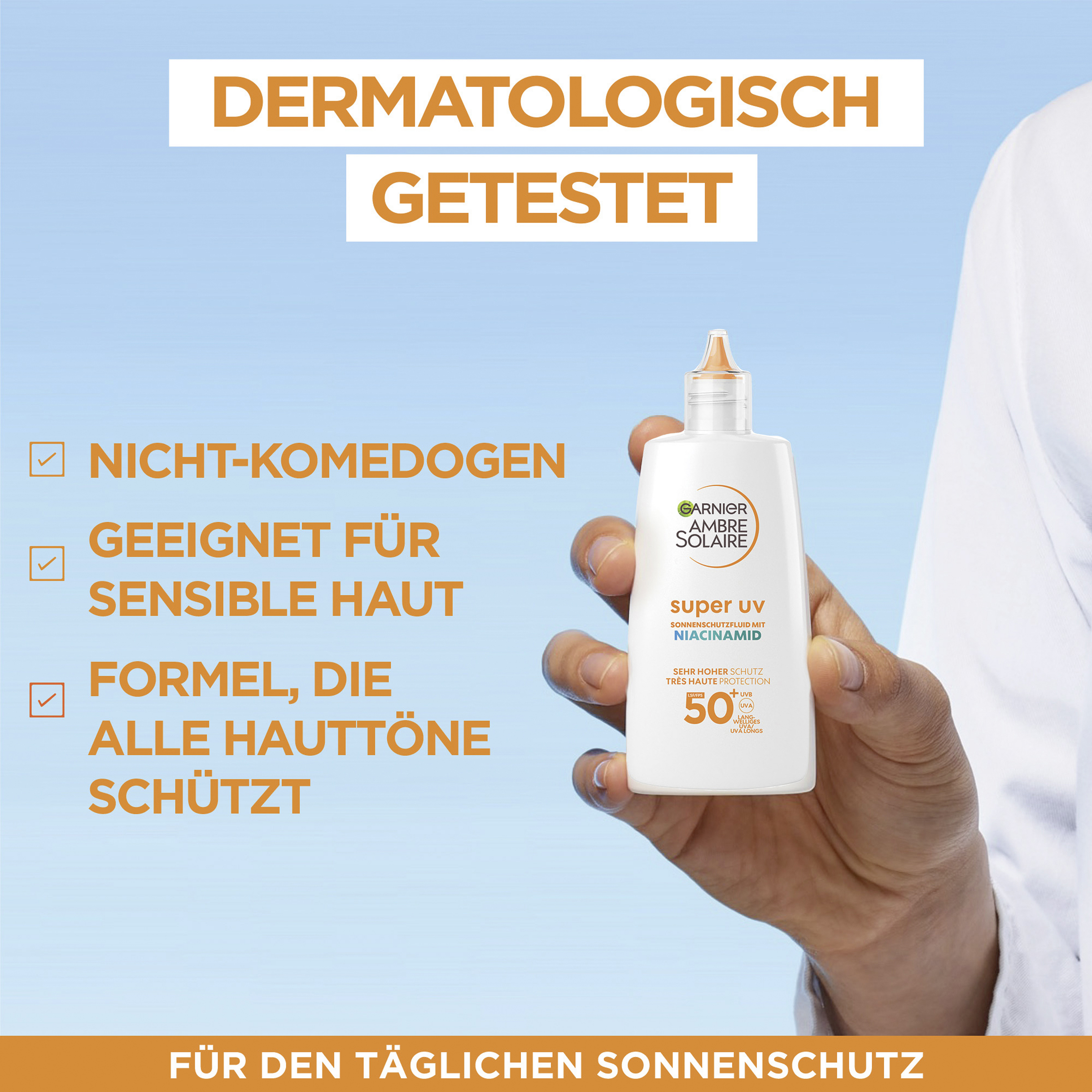 Das Super UV Sonnenschutzfluid Anti-Unreinheiten schützt die Haut mit einem Lichtschutzfaktor 50+ und hilft dabei, sichtbare Poren merklich zu mildern. Die Formel wirkt bis zu 12 Stunden und sorgt für ein unsichtbares Finish, ohne einen fettigen Film auf der Haut zu hinterlassen. Der Sonnenschutz kann dank seiner pflegenden Wirkstoffkombination ohne Bedenken auf unreiner Haut angewandt werden.