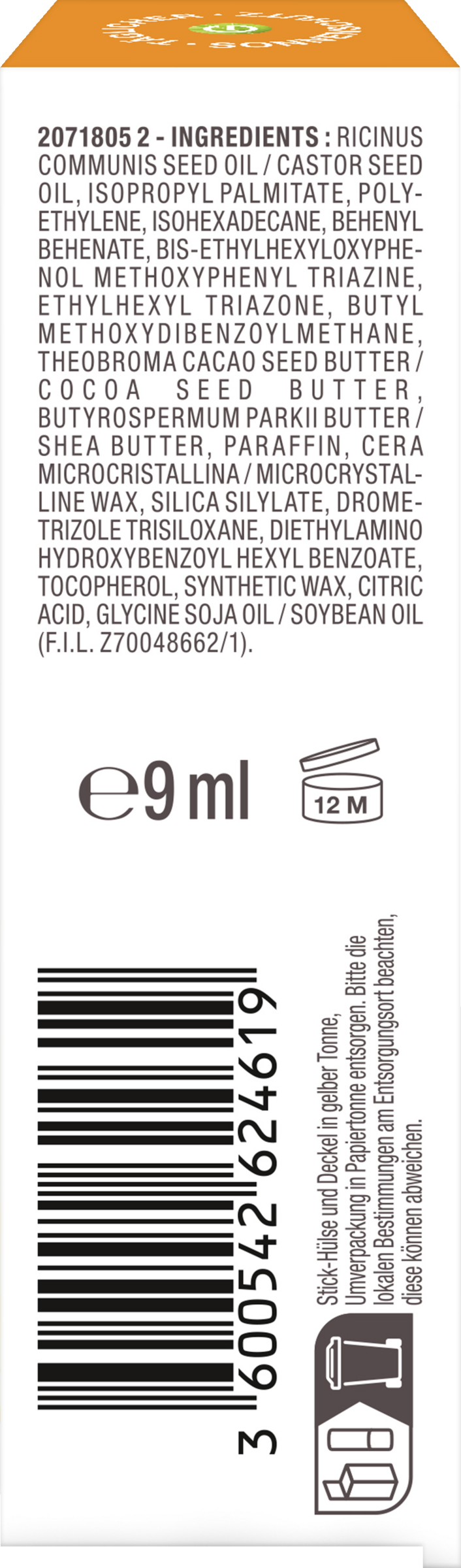 RICINUS COMMUNIS SEED OIL / CASTOR SEED OIL • ISOPROPYL PALMITATE • POLYETHYLENE • ISOHEXADECANE • BEHENYL BEHENATE • BIS-ETHYLHEXYLOXYPHENOL METHOXYPHENYL TRIAZINE • ETHYLHEXYL TRIAZONE • BUTYL METHOXYDIBENZOYLMETHANE • THEOBROMA CACAO SEED BUTTER / COCOA SEED BUTTER • BUTYROSPERMUM PARKII BUTTER / SHEA BUTTER • PARAFFIN • CERA MICROCRISTALLINA / MICROCRYSTALLINE WAX • SILICA SILYLATE • DROMETRIZOLE TRISILOXANE • DIETHYLAMINO HYDROXYBENZOYL HEXYL BENZOATE • TOCOPHEROL • SYNTHETIC WAX • CITRIC ACID • GLYCINE SOJA OIL / SOYBEAN OIL (F.I.L. Z70048662/1).