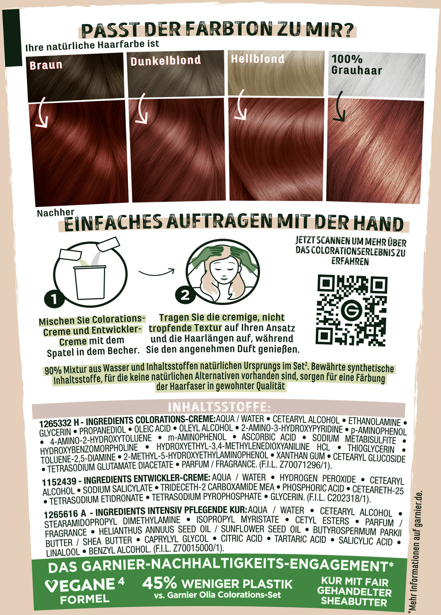 Die Garnier GOOD Dauerhafte Haarfarbe in 6.52 Mahagoni Rotbraun verleiht dem Haar eine natürlich aussehende rote Farbe mit seidigen Reflexen und bis zu 100 % Grauabdeckung. Gleichzeitig sorgt die Coloration für bis zu acht Wochen langanhaltende Farbe sowie für schöne Effekte und Farbschattierungen. Die vegane Formel ohne Ammoniak lässt sich dabei ganz einfach mit der Hand anwenden und hinterlässt einen angenehmen Duft. Für eine optimale Pflege danach ist ebenfalls eine pflegende Haarkur mit Shea Butter enthalten. Die Verpackung enthält im Sinne der Nachhaltigkeit 45 % weniger Plastik und die Inhaltsstoffe der Coloration sind natürlichen Ursprungs.