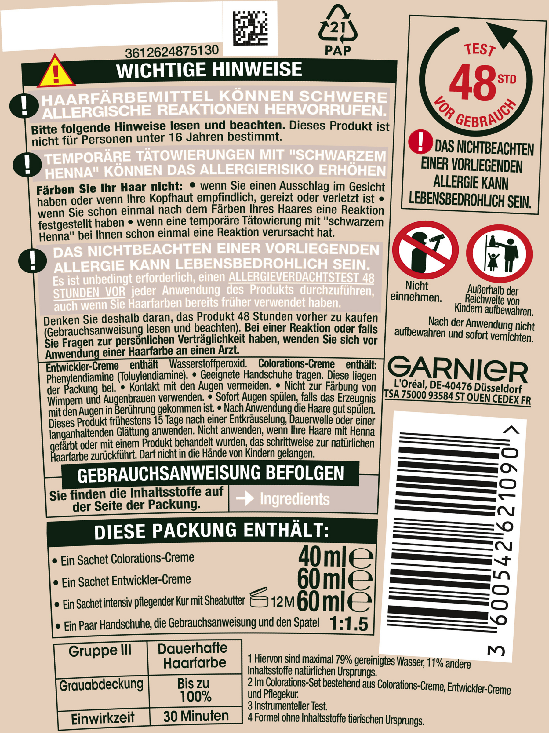 Geeignete Handschuhe tragen. Diese liegen der Packung bei. Kontakt mit den Augen vermeiden. Nicht zur Färbung von Wimpern und Augenbrauen verwenden. Sofort Augen spülen, falls das Erzeugnis mit den Augen in Berührung gekommen ist. Nach Anwendung die Haare gut spülen. Dieses Produkt frühestens 15 Tage nach einer Entkräuselung, Dauerwelle oder einer langanhaltenden Glättung anwenden. Nicht anwenden, wenn Ihre Haare mit Henna gefärbt oder mit einem Produkt behandelt wurden, das schrittweise zur natürlichen Haarfarbe zurückführt. Darf nicht in die Hände von Kindern gelangen. GEBRAUCHSANWEISUNG BEFOLGEN.