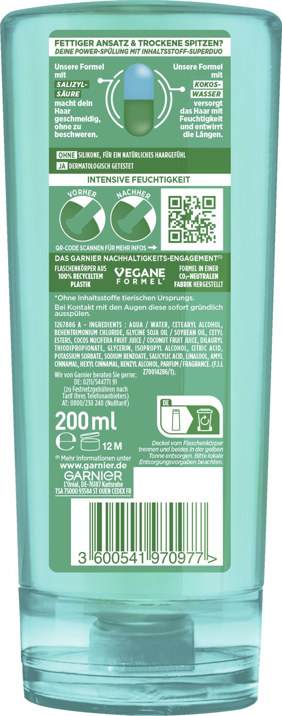 Viele kennen das: Die Haare sind fettig am Ansatz und die Spitzen trocken. Garnier Fructis Coco Water Kräftigende Spülung wurde speziell für diese Situation entwickelt. Die Spülung stärkt das Haar und die Kopfhaut und versorgt die trockenen Spitzen mit Feuchtigkeit. Eine besondere Kombination aus Kokoswasser, Vitaminen B3 und B6 sowie Zitronenprotein sorgt dabei für gesund aussehendes, kraftvolleres Haar. Nach der Haarwäsche ist das Haar frisch, leicht und gepflegt. Die sanfte Formel ist ideal für die tägliche Anwendung geeignet.