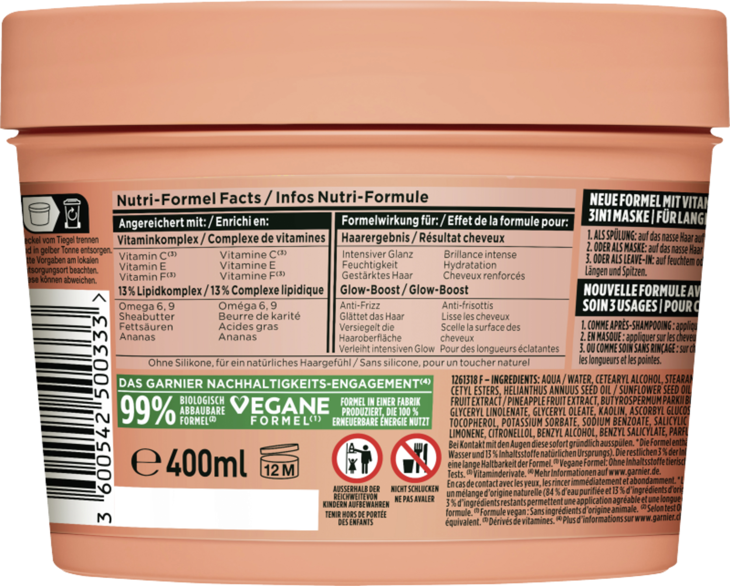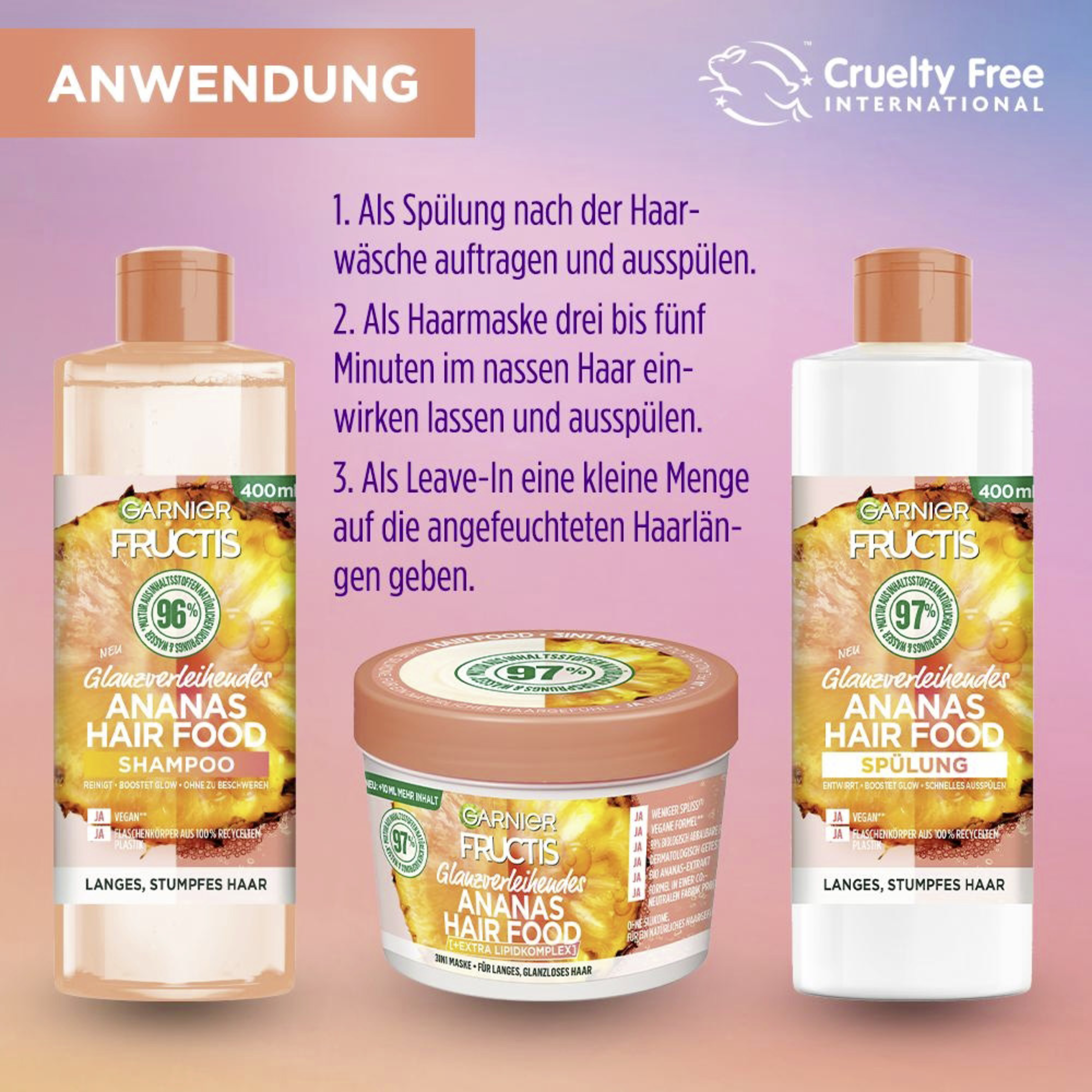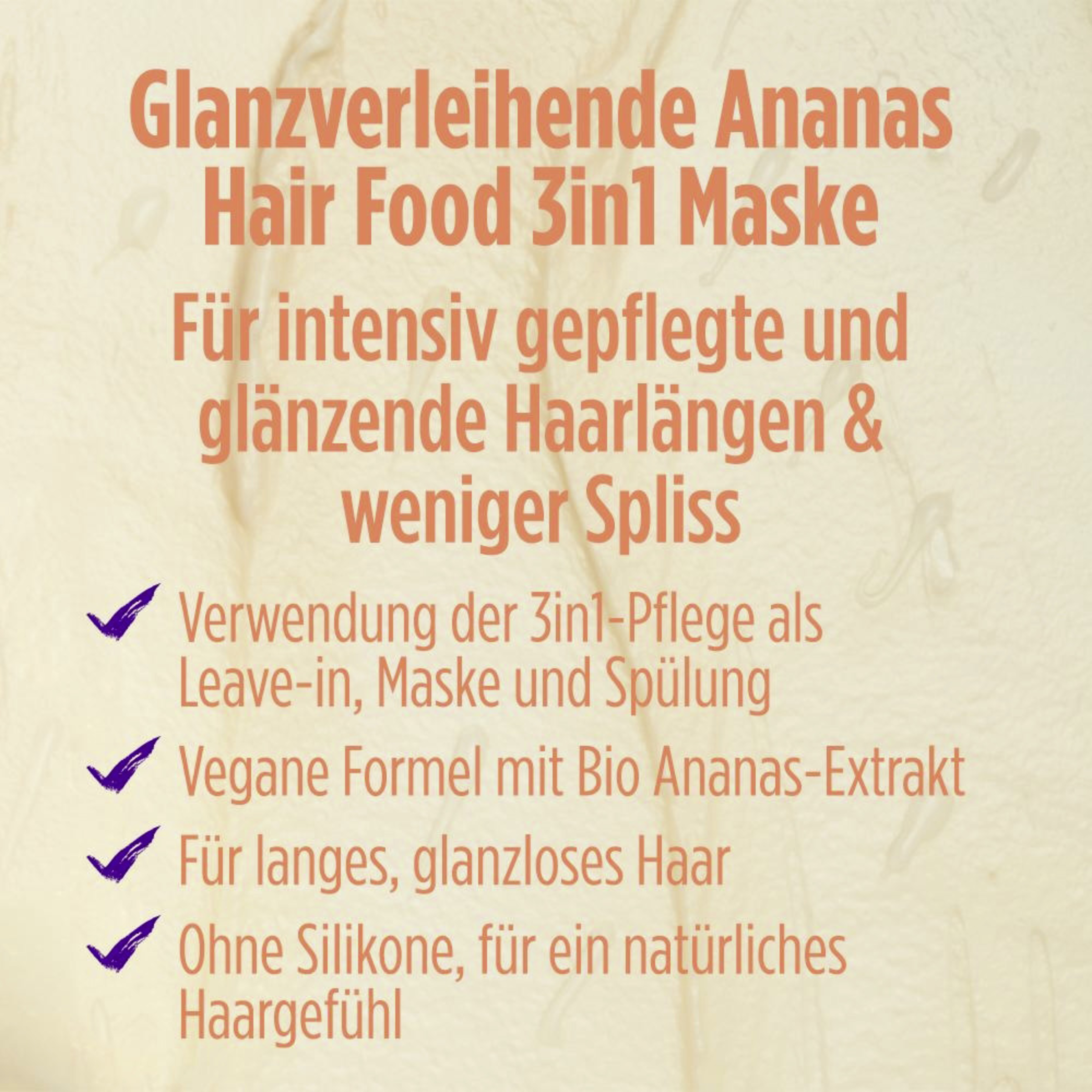Das Fructis glanzverleihende Ananas Hair Food von Garnier ist eine 3in1 Pflege für langes, glanzloses Haar. Dabei kann das Hair Food sowohl als Haarmaske als auch als Leave-in sowie als Spülung verwendet werden. Die Formel enthält 97 % Inhaltsstoffe natürlichen Ursprungs, wodurch die Maske besonders umweltschonend ist. Dabei enthält die vegane Formel Bio-Ananas-Extrakt.