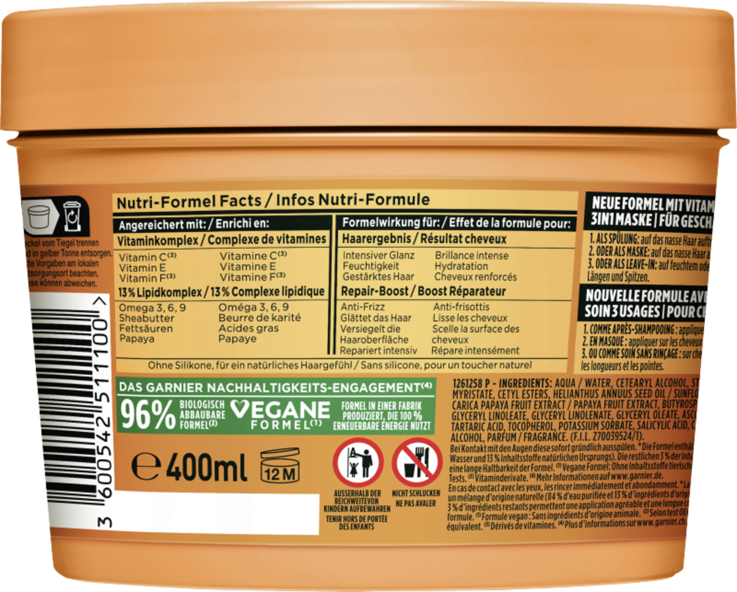 Heißhunger auf eine Haarpflege ohne Schnickschnack? Das Garnier Fructis Reparierendes Papaya Hair Food ist mehr als nur Haarpflege. Es verwöhnt geschädigtes Haar mit einer intensiven Pflege, die auf drei verschiedene Arten angewendet werden kann. Speziell für geschädigtes Haar entwickelt, repariert die mit Papaya angereicherte Formel das Haar und schenkt ihm mehr Geschmeidigkeit. Dabei lässt sich die cremige 3-in-1 Pflege je nach individuellen Bedürfnissen sowohl als Spülung, Maske oder als Leave-In anwenden – ganz so, wie es das Haar gerade braucht. Die wunderbar leichte Textur des Hair Foods zieht sofort ein und pflegt hungriges Haar intensiv, ohne es dabei zu beschweren. Und das Beste: Das Garnier Fructis Reparierendes Papaya Hair Food ist vegan und besteht zu 98% aus Inhaltsstoffen natürlichen Ursprungs.