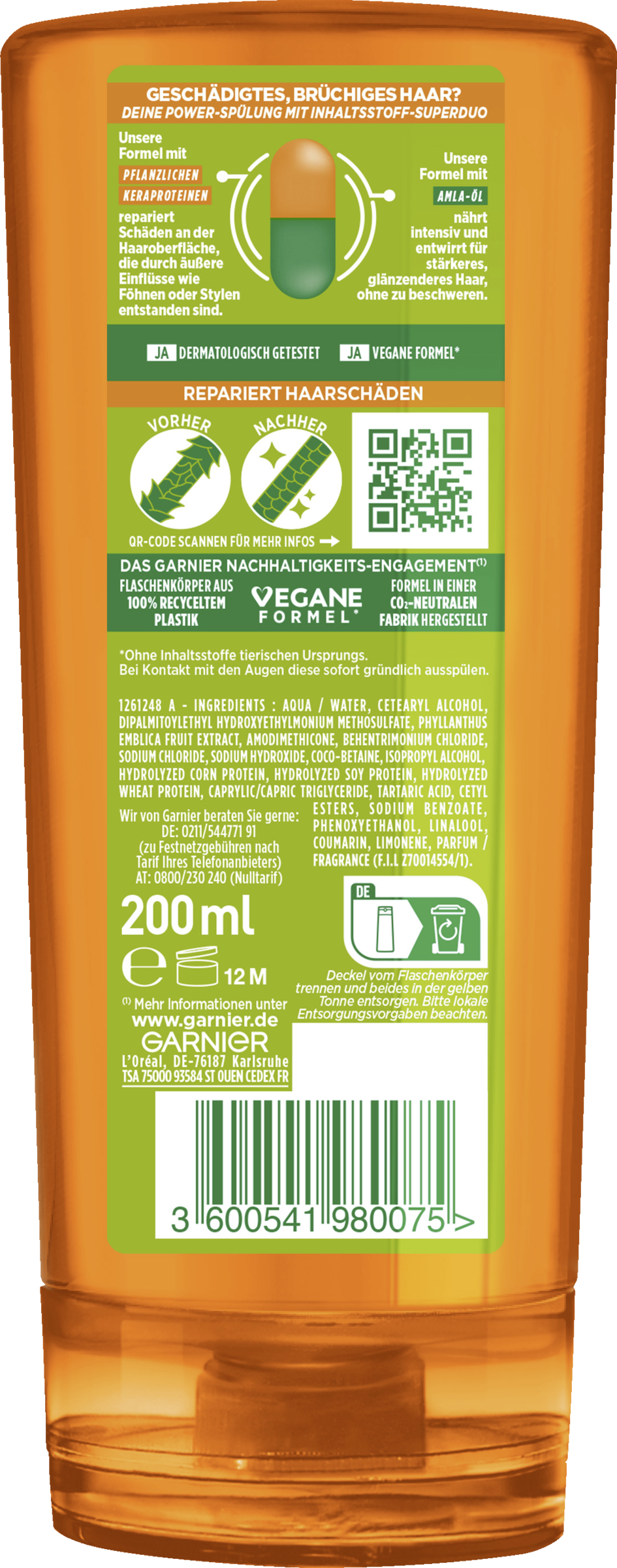 Stark geschädigtes Haar braucht intensive Pflege. Genau das bietet Garnier Fructis Schaden Löscher Kräftigende Spülung. Sie vereint Amla-Öl und reparierendes Keraphyll, um selbst kleinste Haarschäden an der Haaroberfläche zu reparieren, die durch externe Einflüsse (z.B. Glätten, Föhnen, Färben) entstehen können. Gleichzeitig wird das Haar vor weiteren Schäden geschützt. Eine besondere Kombination aus pflanzlichen Fruchtwirkstoffen, Vitaminen B3 und B6 sowie Zitronenprotein kräftigt das Haar zusätzlich. Das Ergebnis: Das Haar hat weniger Spliss, die Längen sind kräftiger und mit Feuchtigkeit versorgt.