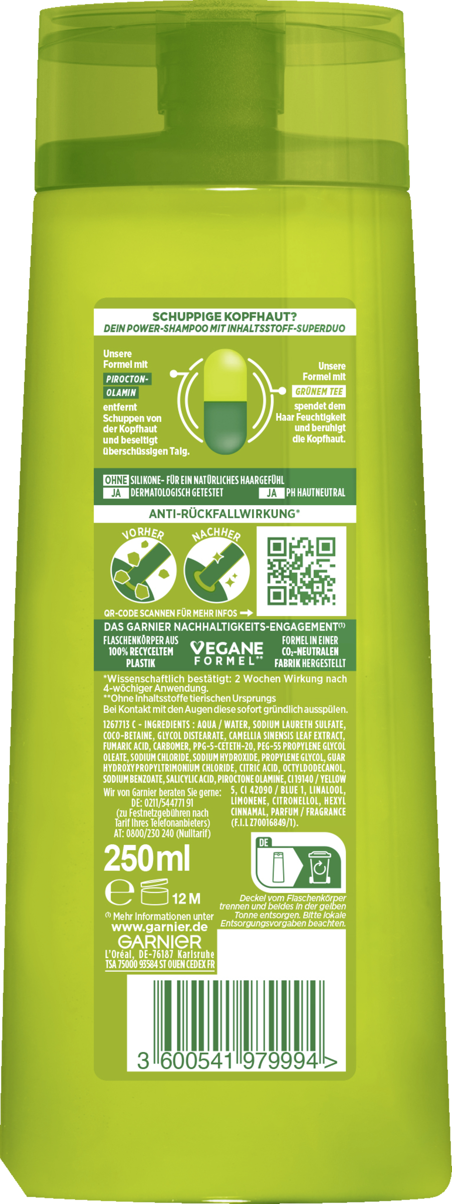 Garnier Fructis Anti-Schuppen Shampoo ist eine echte Wunderwaffe im Kampf gegen Schuppen. Mit Grüntee und Pircoton-Olamin angereichert, befreit es die Kopfhaut von Schuppen und verleiht dem Haar neuen Glanz. Mit Anti-Rückfallwirkung: Nach 4 Wochen regelmäßiger Anwendung werden die Schuppen für 2 Wochen beseitigt. Das Produkt ist für alle Haartypen geeignet und kann täglich angewendet werden. Der Flaschenkörper ist zudem aus 100% recyceltem Plastik.