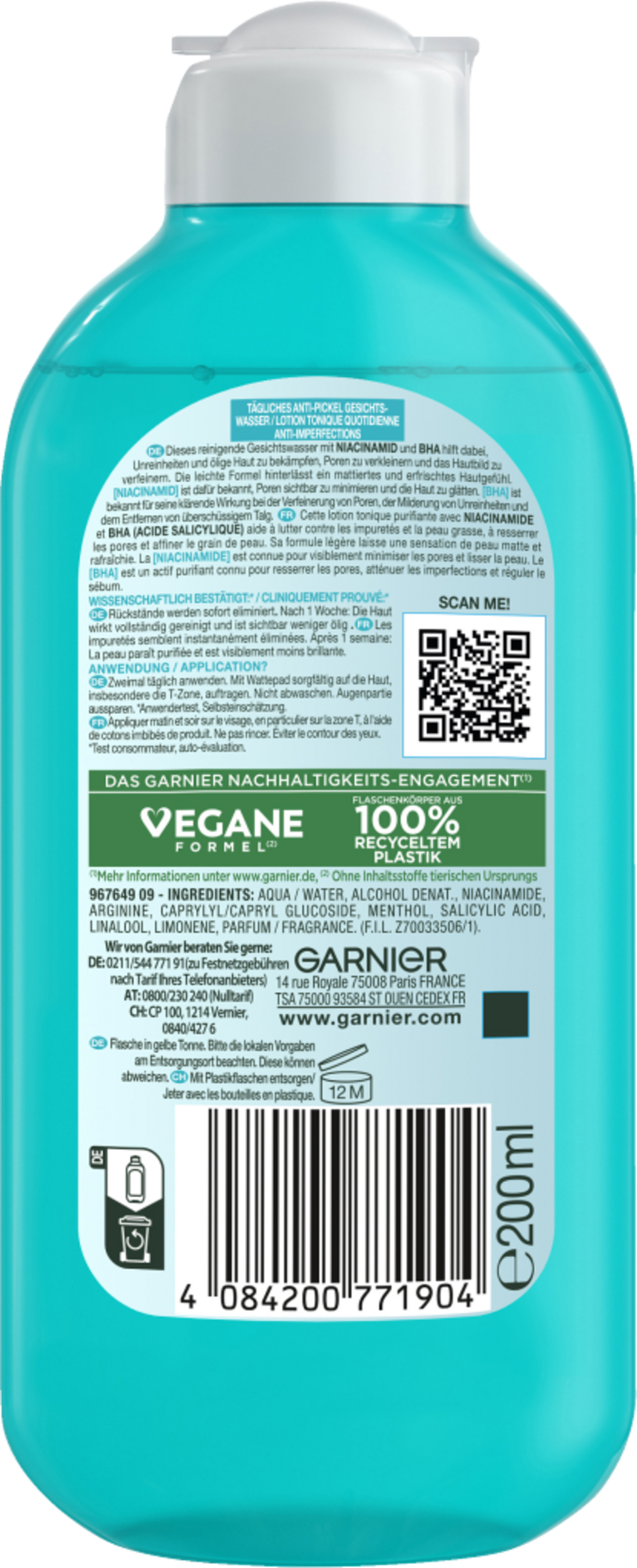 Mit dem GARNIER Tägliches Anti-Pickel Gesichtswasser können Sie Pickel und Mitesser in nur einem Schritt gleich dreifach bekämpfen. Die Reinigung ist dank seiner effektiven Kombination aus hautklärenden und reinigenden Wirkstoffen eine einfache Lösung gegen Hautunreinheiten. Das klärende Zink und antibakterielle Salizylsäure entfernen Unreinheiten und trocknen sie zudem gezielt aus. Zugleich reguliert das erfrischende Gesichtswasser die Talgproduktion und absorbiert das überschüssige Hautfett.