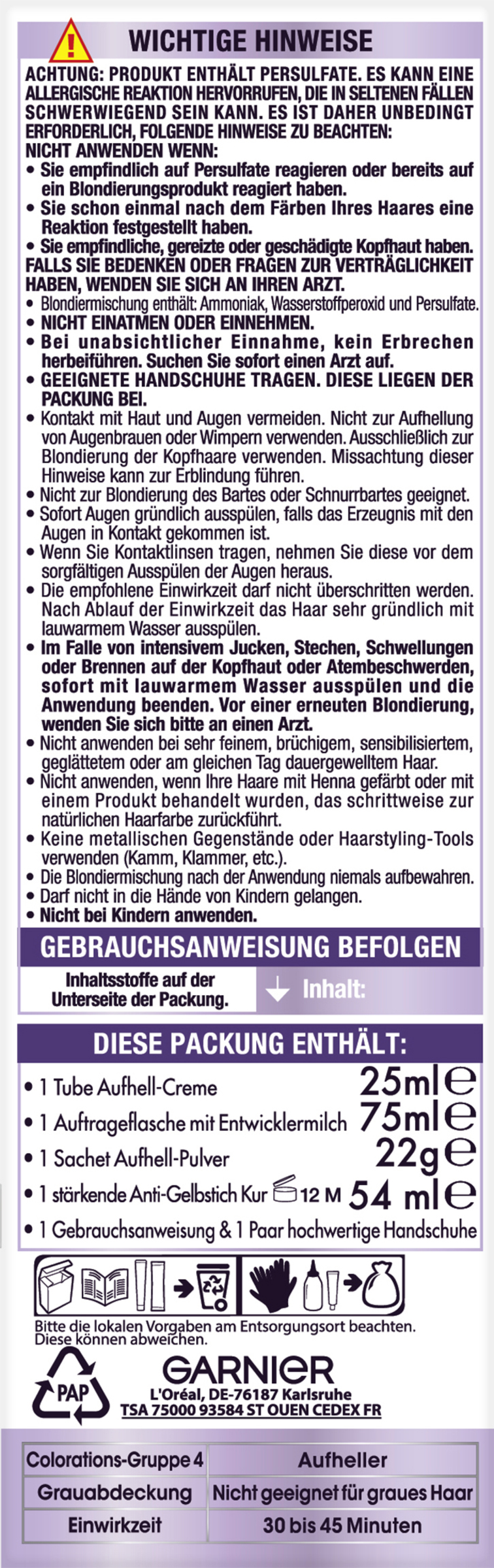 PRODUKT ENTHALT PERSULFATE. ES KANN EINE ALLERGISCHE REAKTION HERVORRUFEN, DIE IN SELTENEN FALLEN SCHWERWIEGEND SEIN KANN. ES IST DAHER UNBEDINGT ERFORDERLICH, FOLGENDE HINWEISE ZU BEACHTEN: NICHT ANWENDEN WENN: