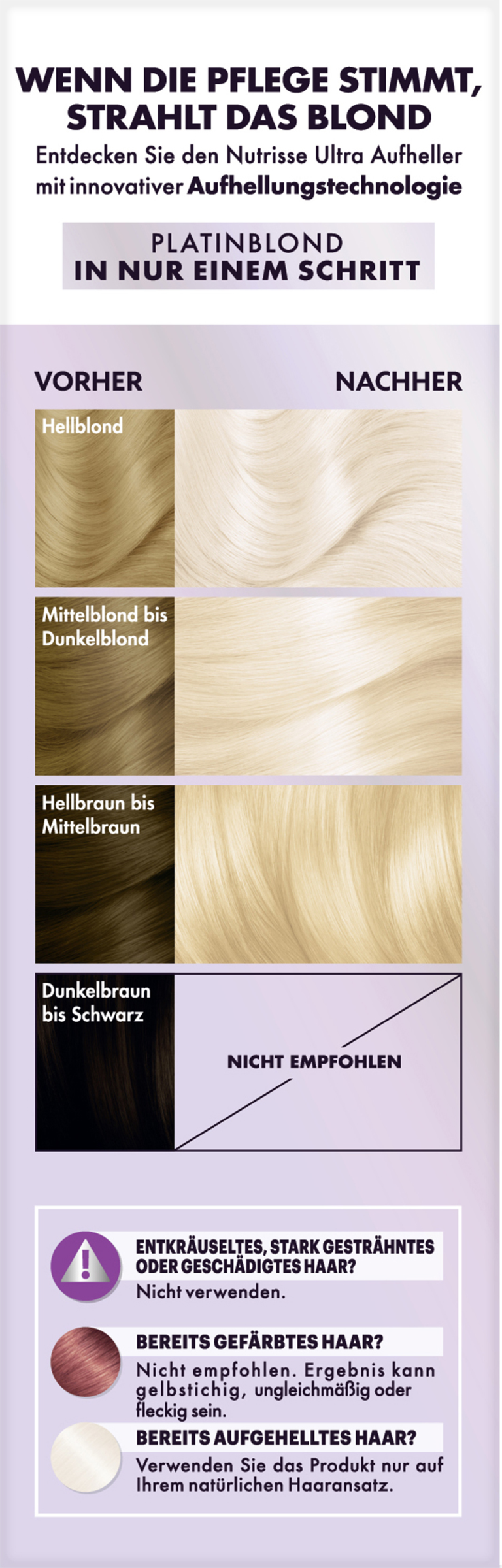 Der Garnier Nutrisse Ultra Bleach D4+ Ultra Aufheller mit innovativer Aufhellungs-Technologie hellt das Haar, auch braunes Haar, mithilfe von Öl um bis zu neun Stufen auf. In dem Aufhellungs-Set enthalten ist dabei sowohl eine Aufhell-Creme, Entwicklermilch, Aufhell-Pulver sowie eine stärkende Anti-Gelbstich-Kur. Diese wird nach der Aufhellung zur Nachbehandlung angewendet und enthält violette Farbpigmente. Diese reduzieren bei jeder Anwendung den Gelbstich und sorgen für ein glänzendes platinblondes Farbergebnis. Darüber hinaus wird das Haar intensiv gepflegt und Haarbruch wird dank der Bonding-Technologie entgegengewirkt, da die innere Struktur des Haares gestärkt wird.