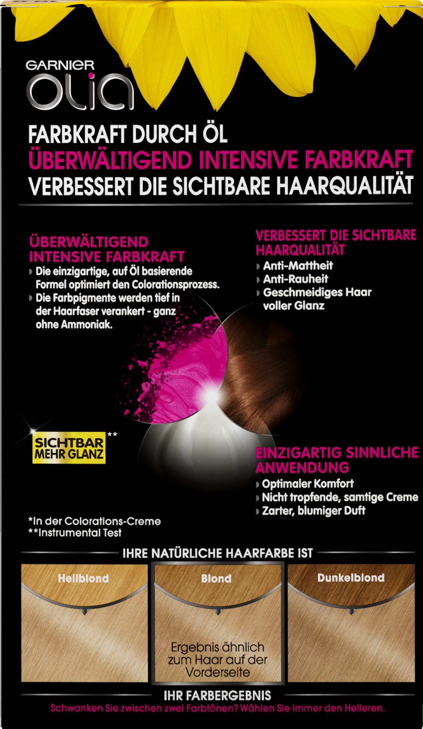 - Colorations-Creme ohne Ammoniak enthält 60 % Öle, die die Farbe tief in der Haarfaser verankern und die Farbkraft aktivieren