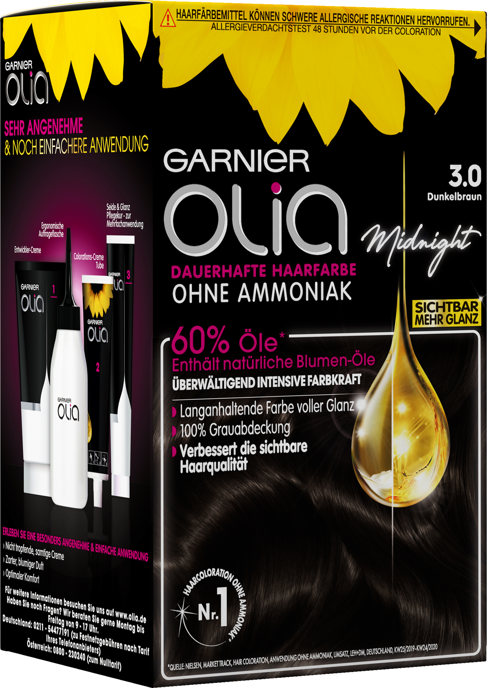 Garnier Olia Nr. 3.0 in Dunkelbraun verleiht den Haaren einen langanhaltenden dunklen Braunton. Die dauerhafte Haarfarbe ohne Ammoniak sorgt für intensive Farbkraft und geschmeidiges, glänzendes Haar. Die Colorations-Creme ist zu 60 % mit Ölen angereichert. Diese aktivieren die strahlende Kraft der Farbe, indem sie die hochwirksamen Pigmente tief in der Haarfaser verankern. Auch graues Haar wird zuverlässig abgedeckt.Gleichzeitig verwöhnt die Coloration das Haar mit reichhaltiger Pflege für eine sichtbar verbesserte Haarqualität.Die cremig-samtige Textur von Garnier Olia tropft nicht und lässt sich mühelos und gleichmäßig auftragen. Dabei entfaltet sie einen zart blumigen Duft.