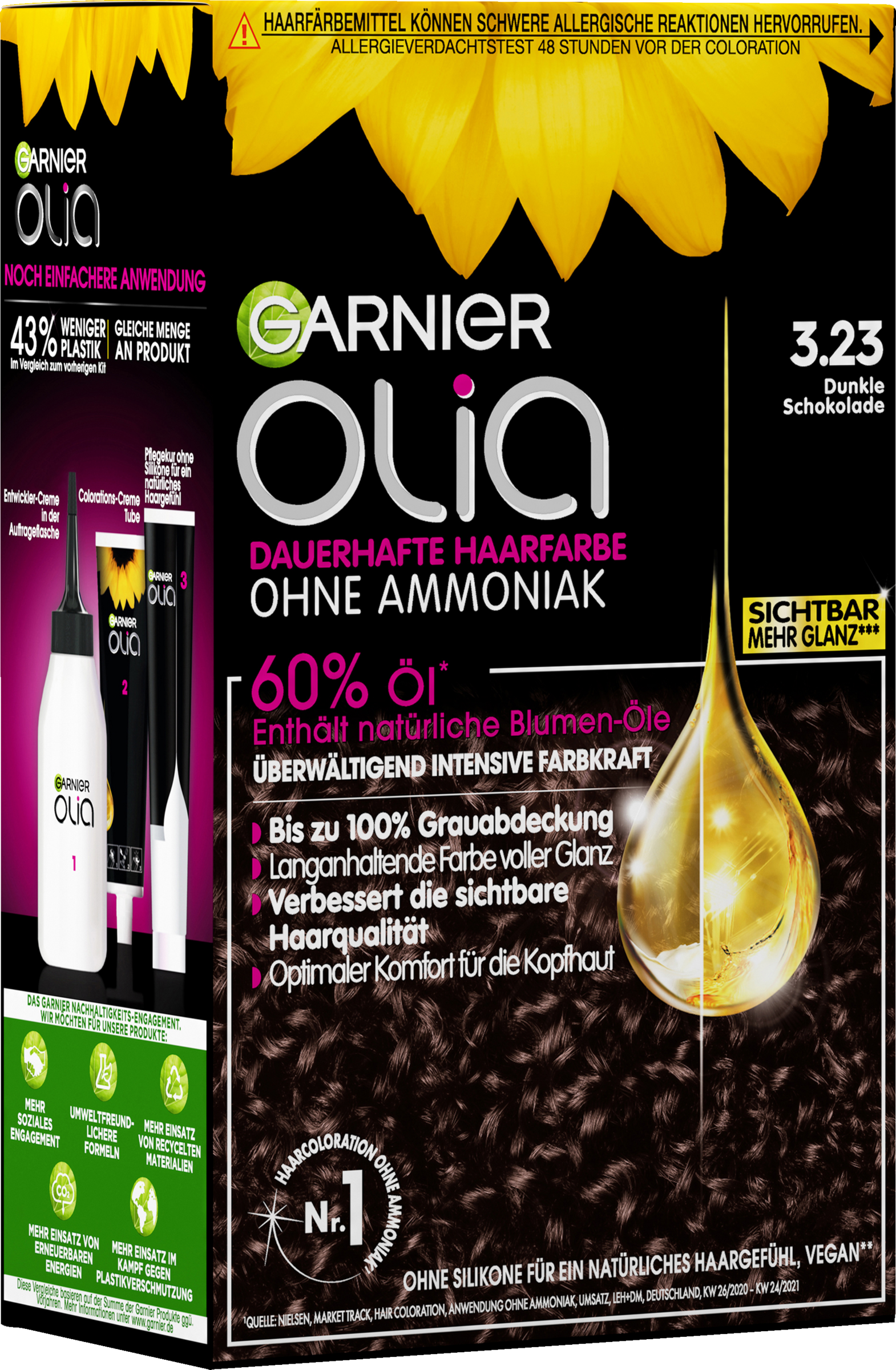 Garnier Olia Nr. 3.23 in Dunkler Schokolade verleiht den Haaren einen langanhaltenden dunklen Braunton. Die dauerhafte Haarfarbe ohne Ammoniak für einen angenehmen Duft sorgt für intensive Farbkraft und geschmeidiges, glänzendes Haar. Die Colorations-Creme ist zu 60 % mit Ölen angereichert. Diese aktivieren die strahlende Kraft der Farbe, indem sie die hochwirksamen Pigmente tief in der Haarfaser verankern. Auch graues Haar wird zuverlässig abgedeckt. Gleichzeitig verwöhnt die Coloration das Haar mit reichhaltiger Pflege für eine sichtbar verbesserte Haarqualität. Die cremig-samtige Textur von Garnier Olia tropft nicht und lässt sich mühelos und gleichmäßig auftragen.