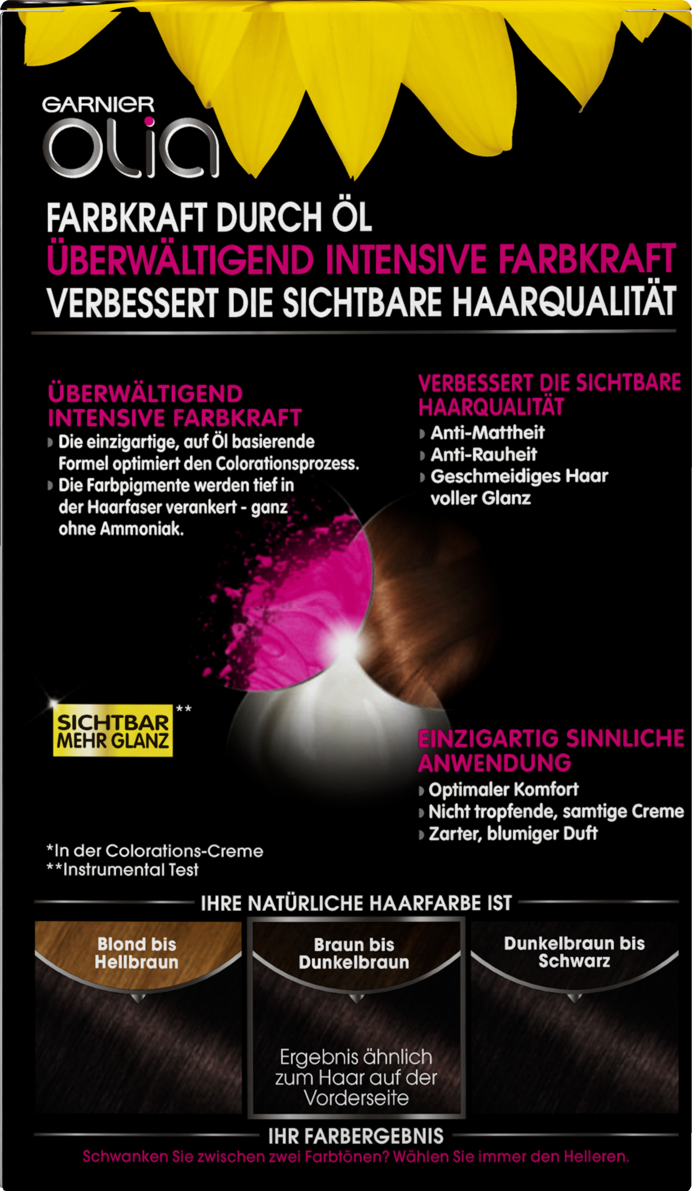 - Colorations-Creme ohne Ammoniak enthält 60 % Öle, die die Farbe tief in der Haarfaser verankern und die Farbkraft aktivieren