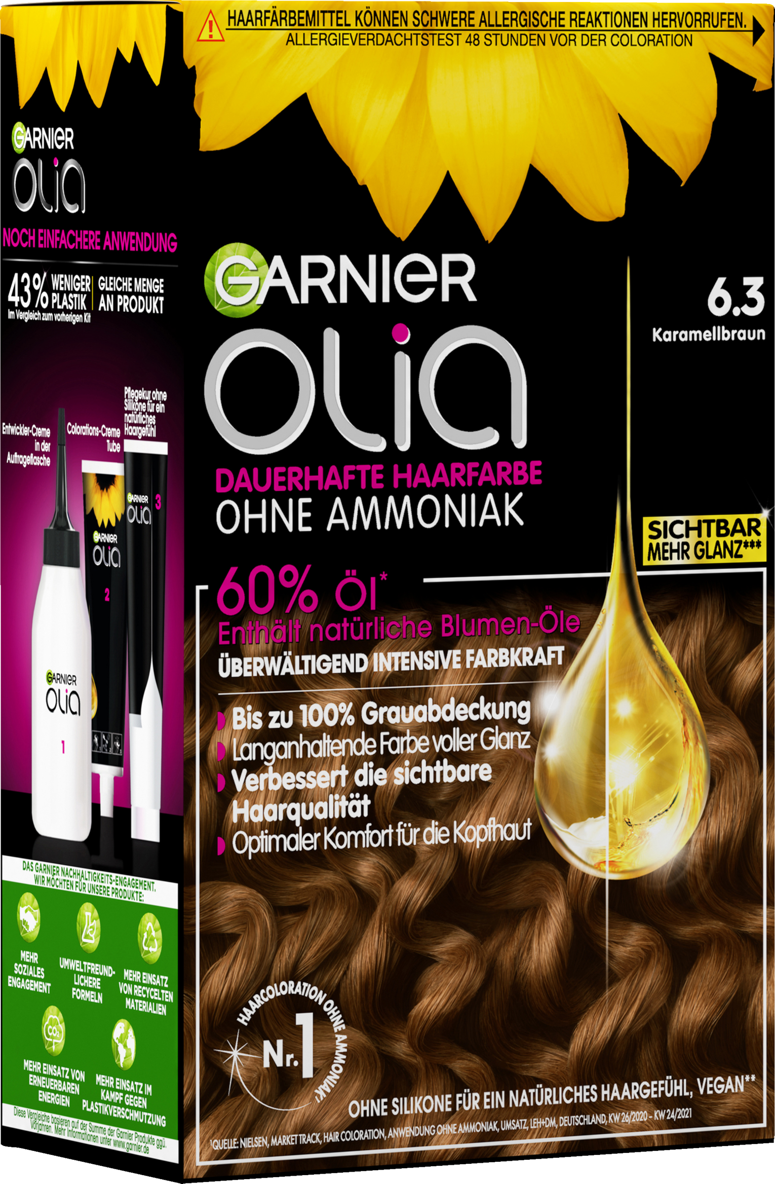 Garnier Olia Nr. 6.3 in Karamellbraun verleiht den Haaren einen langanhaltenden, goldenen Braunton. Die dauerhafte Haarfarbe ohne Ammoniak sorgt für intensive Farbkraft und geschmeidiges, glänzendes Haar. Die Colorations-Creme ist zu 60 % mit Ölen angereichert. Diese aktivieren die strahlende Kraft der Farbe, indem sie die hochwirksamen Pigmente tief in der Haarfaser verankern. Auch graues Haar wird zuverlässig abgedeckt.Gleichzeitig verwöhnt die Coloration das Haar mit reichhaltiger Pflege für eine sichtbar verbesserte Haarqualität.Die cremig-samtige Textur von Garnier Olia tropft nicht und lässt sich mühelos und gleichmäßig auftragen. Dabei entfaltet sie einen zart blumigen Duft.