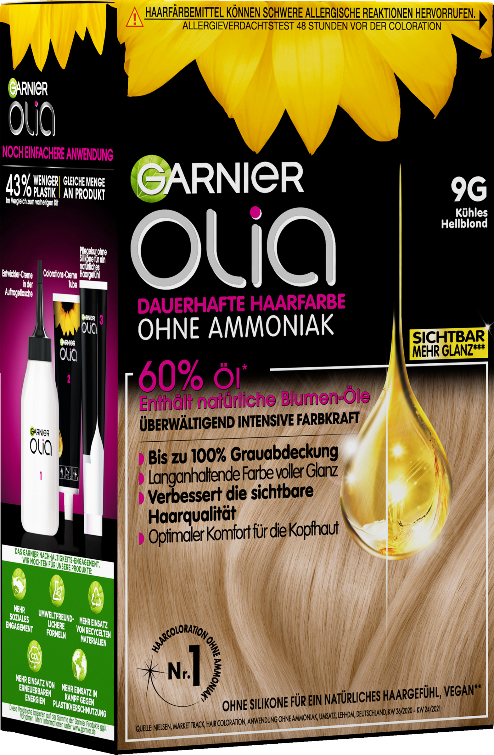 Garnier Olia Nr. 9G Kühles Hellblond verleiht den Haaren einen langanhaltenden, sehr hellen Blond-Ton. Die dauerhafte Haarfarbe ohne Ammoniak sorgt für intensive Farbkraft und geschmeidiges, glänzendes Haar. Die Colorations-Creme ist zu 60 % mit Ölen angereichert. Diese aktivieren die strahlende Kraft der Farbe, indem sie die hochwirksamen Pigmente tief in der Haarfaser verankern. Auch graues Haar wird zuverlässig abgedeckt.Gleichzeitig verwöhnt die Coloration das Haar mit reichhaltiger Pflege für eine sichtbar verbesserte Haarqualität.Die cremig-samtige Textur von Garnier Olia tropft nicht und lässt sich mühelos und gleichmäßig auftragen. Dabei entfaltet sie einen zart blumigen Duft.