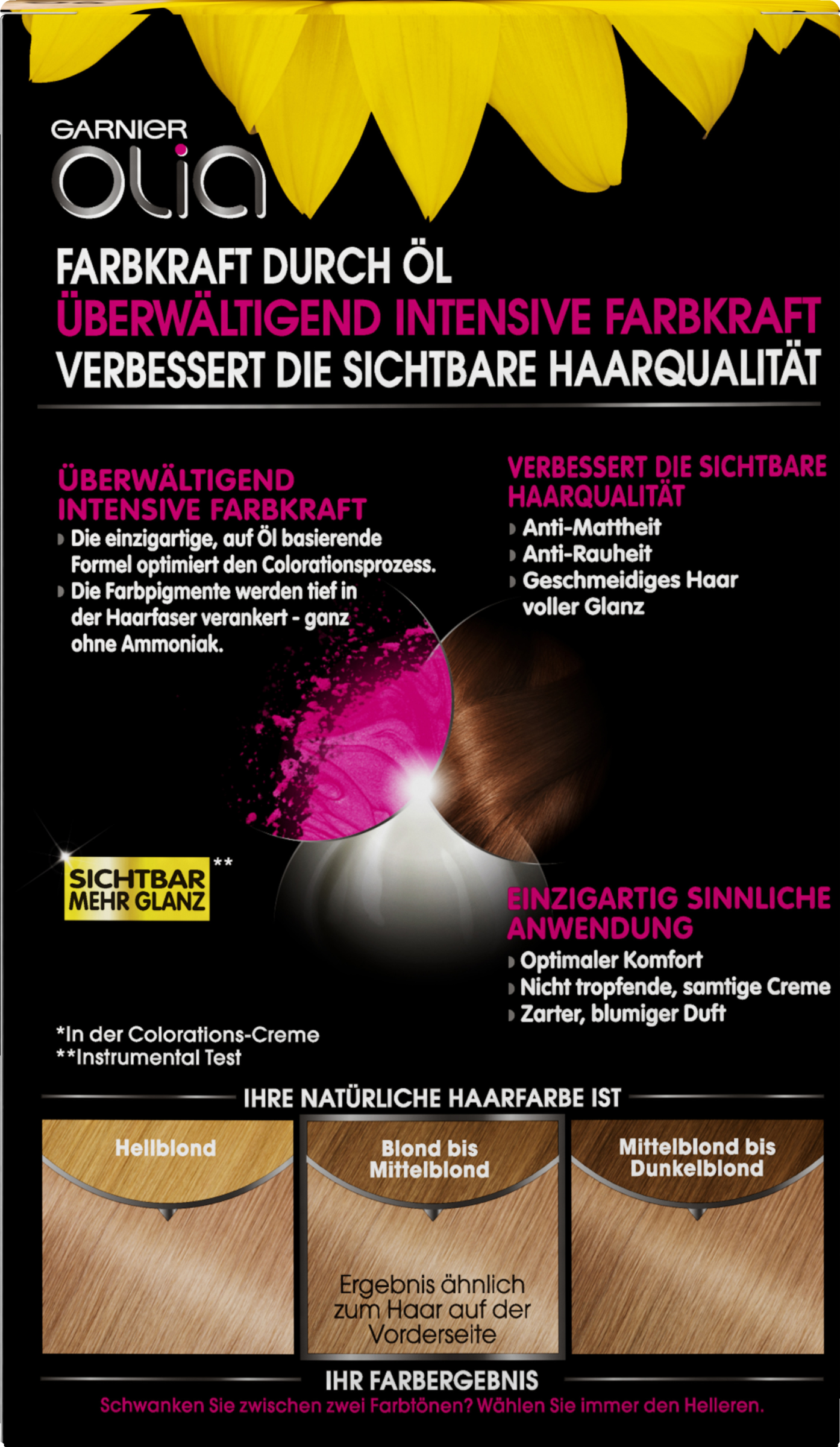 - Colorations-Creme ohne Ammoniak enthält 60 % Öle, die die Farbe tief in der Haarfaser verankern und die Farbkraft aktivieren