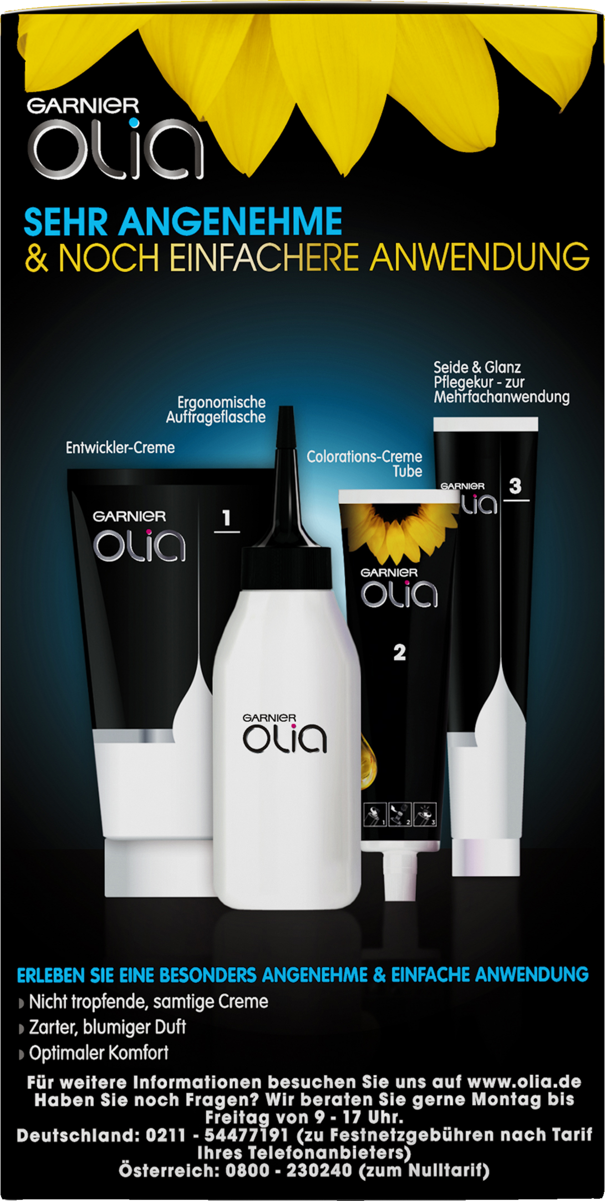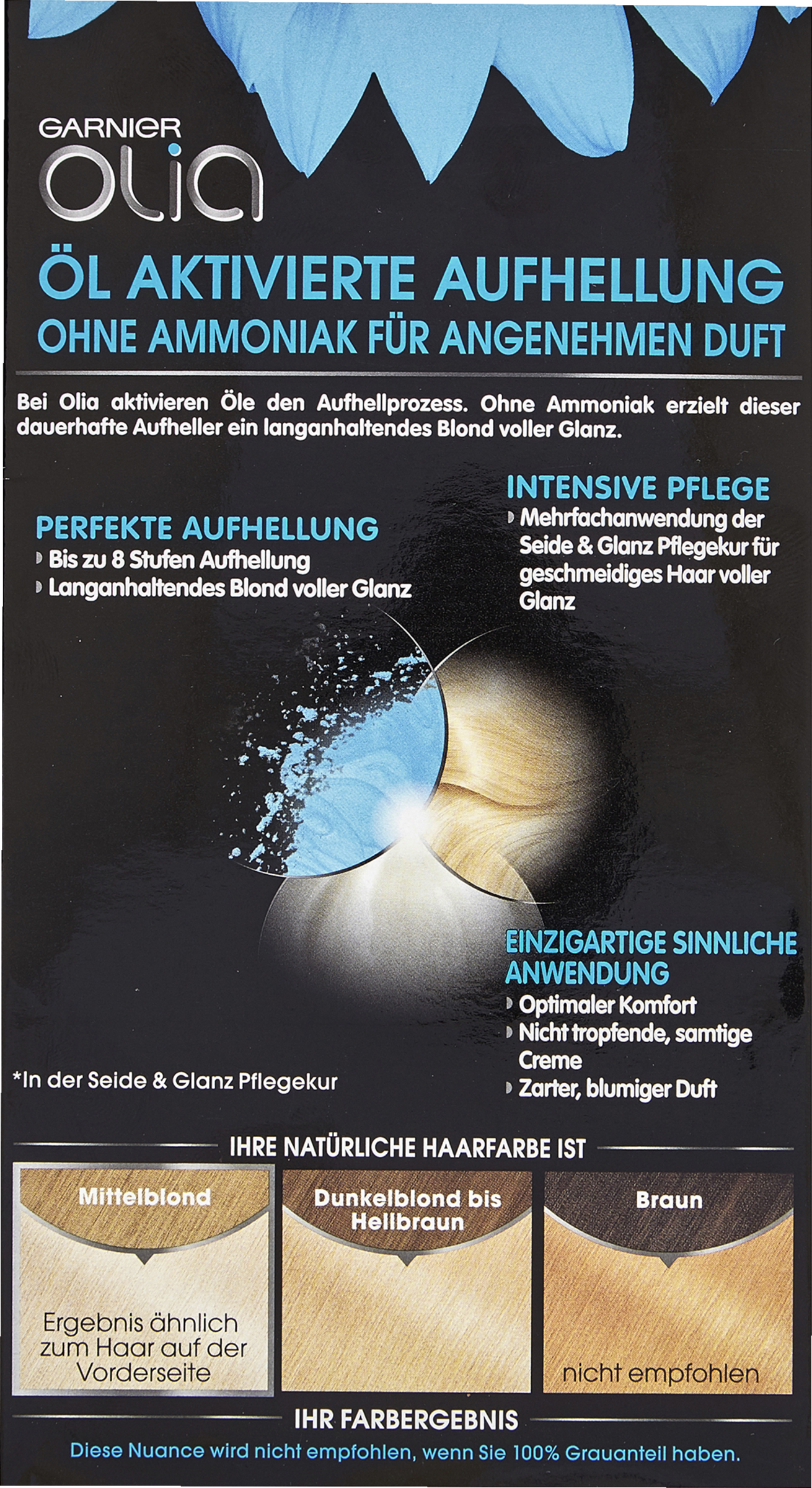 Garnier Olia Aufheller B+++ Ultra: Die dauerhafte Blondierung hellt das Haar um bis zu 8 Stufen auf – sogar bei hellbraunem Haar. Sie sorgt für ein kühles, natürliches und langanhaltendes Blond und geschmeidiges Haar voller Glanz. Die in dem Aufheller enthaltenen Blumen-Öle verankern die Farbpigmente tief in der Haarfaser und aktivieren so die strahlende Kraft der Farbe. Die Formel ohne Ammoniak ist schonend für das Haar, die Anwendung einfach und bequem: Die cremig-samtige Textur tropft nicht und lässt sich gleichmäßig auftragen. Dabei entfaltet die Blondierung einen angenehmen, zart blumigen Duft – für ein sinnliches Erlebnis.