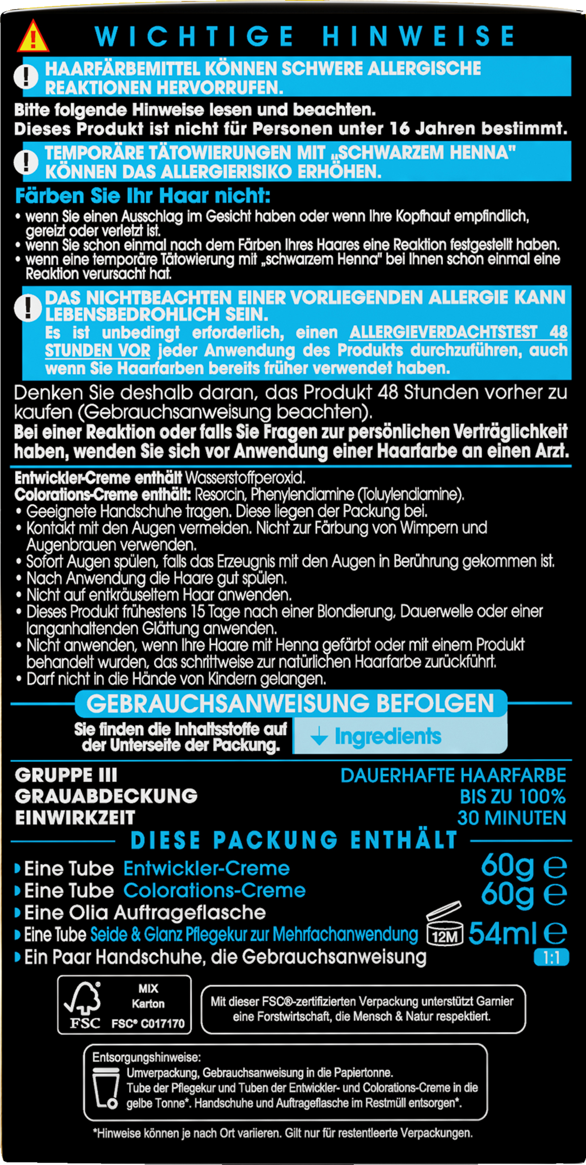 Entwickler: Aqua / Water, Paraffinum Liquidum / Mineral Oil, Hydrogen Peroxide, Cetearyl Alcohol, Sodium Cetearylsulfate, Sodium Salicylate, Sodium Sulfate, PEG-40 Hydrogenated Castor Oil, Phosphoric Acid, Tetrasodium Pyrophosphate.