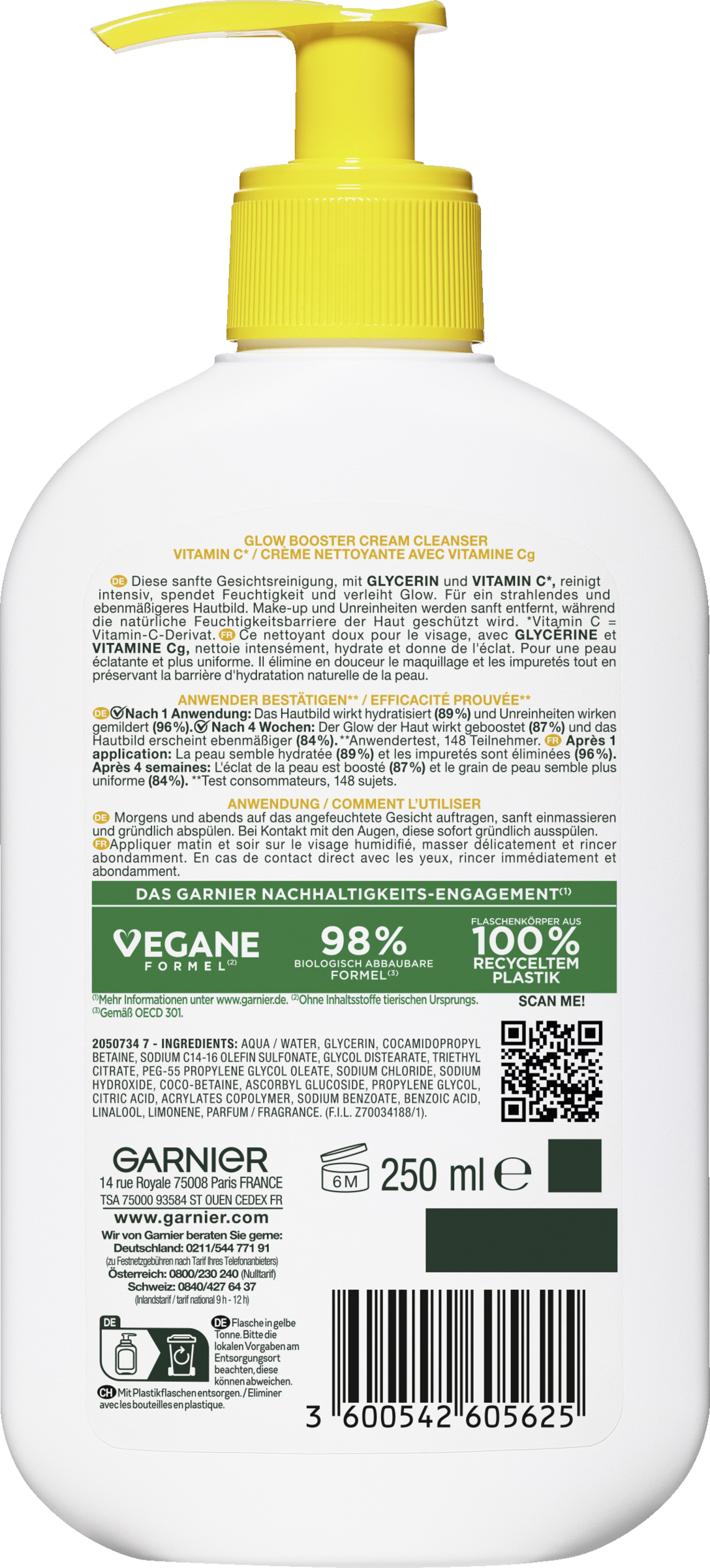 Der SkinActive Glow Booster Cream Cleanser Vitamin C* für fahle und unebenmäßige Haut eignet sich ideal als täglicher Gesichtsreiniger und entfernt Make-up, Schmutz und Unreinheiten sanft und zuverlässig. Die zu 98% biologisch abbaubare vegane Formel ist angereichert mit Vitamin C* Derivat und Glycerin und spendet der Haut bei der täglichen Reinigung intensiv Feuchtigkeit. Gleichzeitig wird die natürliche Feuchtigkeitsbarriere der Haut durch die milde Formulierung geschützt. Nach 1 Woche wirkt die Haut sichtbar hydratisierter und Unreinheiten gemildert, nach 4 Wochen wirkt der Glow der Haut sichtbar geboostet ̶ für ein strahlendes und ebenmäßiges Hautbild.