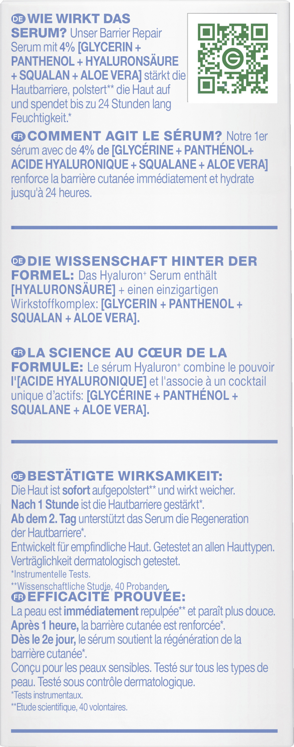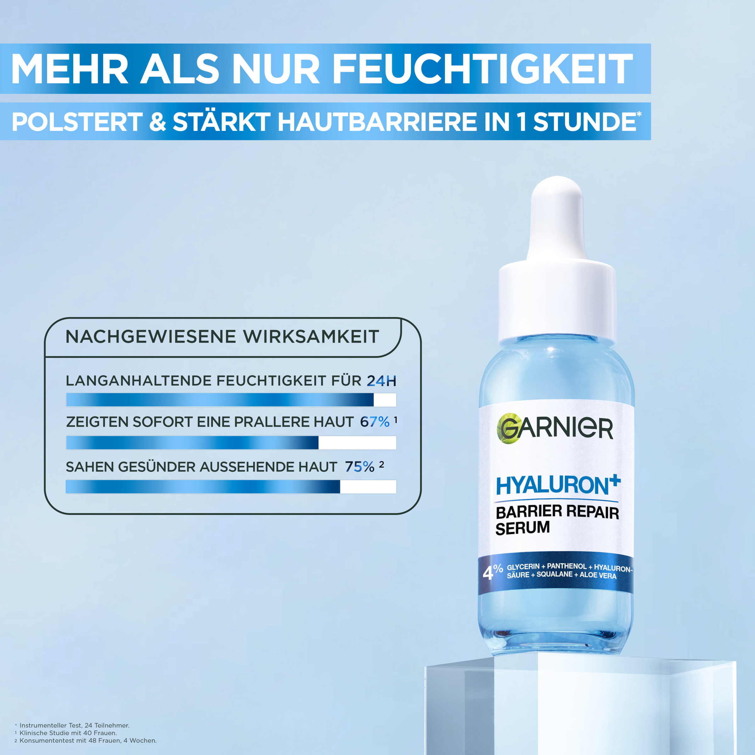 Empfindliche Haut erhält mit dem Hyaluron Barrier Repair Replumping Serum von Garnier eine speziell abgestimmte Pflege, die bis zu 24 Stunden Feuchtigkeit spendet und gleichzeitig die Hautschutzbarriere stärkt. Dafür enthält das Gesichtsserum 4 % Glycerin, Panthenol, Hyaluronsäure, Squalan und Aloe Vera − für weichere und aufgepolsterte Haut. Nach bereits einer Stunde ist die Hautbarriere gestärkt und ab dem 2. Tagen unterstützt das Serum für das Gesicht die Regeneration der Hautschutzbarriere.