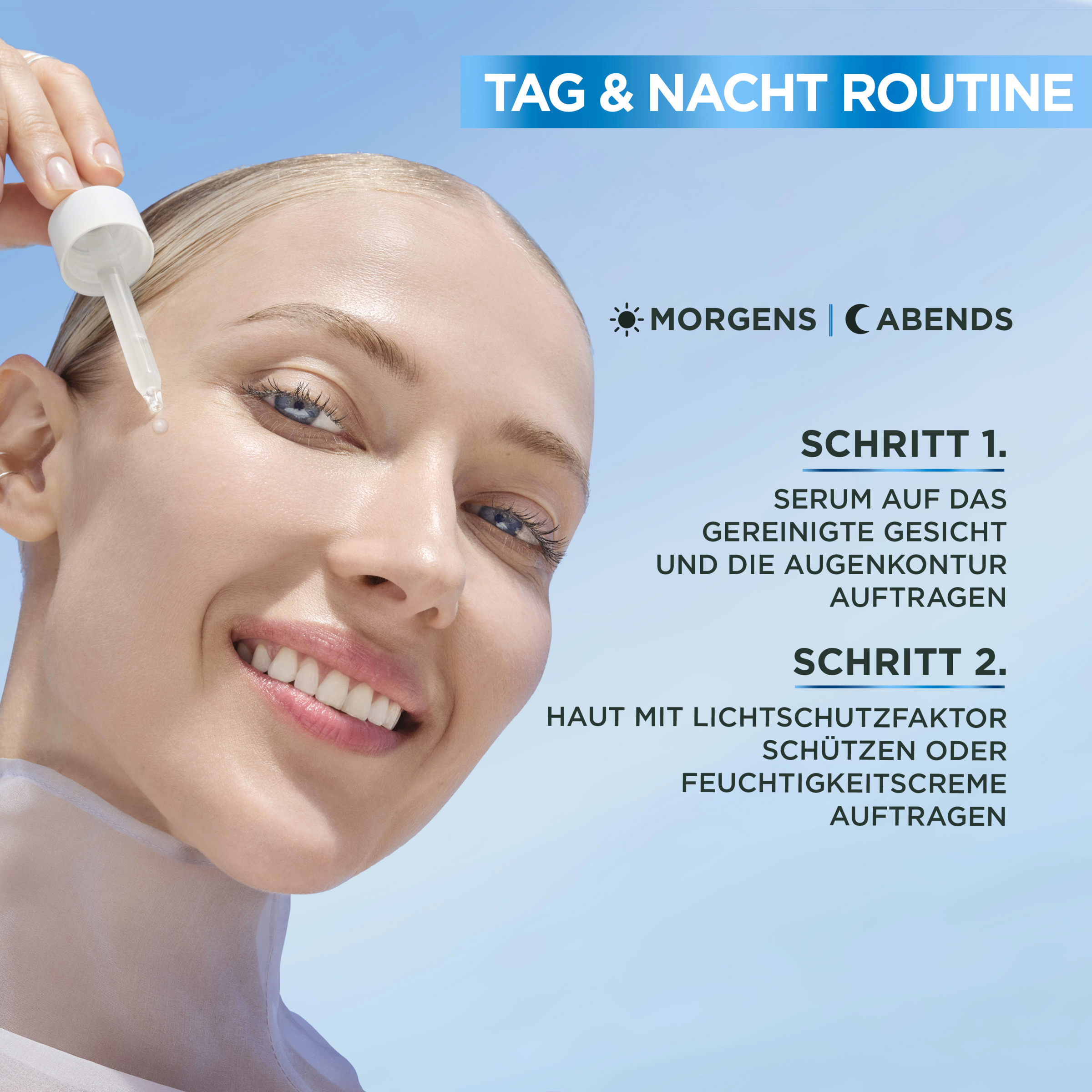 Das Serum morgens oder abends vor dem Auftragen der Tages- oder Nachtcreme anwenden. Dafür eine volle Pipette des Serums auf das gereinigte Gesicht sowie die Augenkonturen geben und anschließend sanft einmassieren. Die leichte Textur zieht schnell ein und klebt nicht