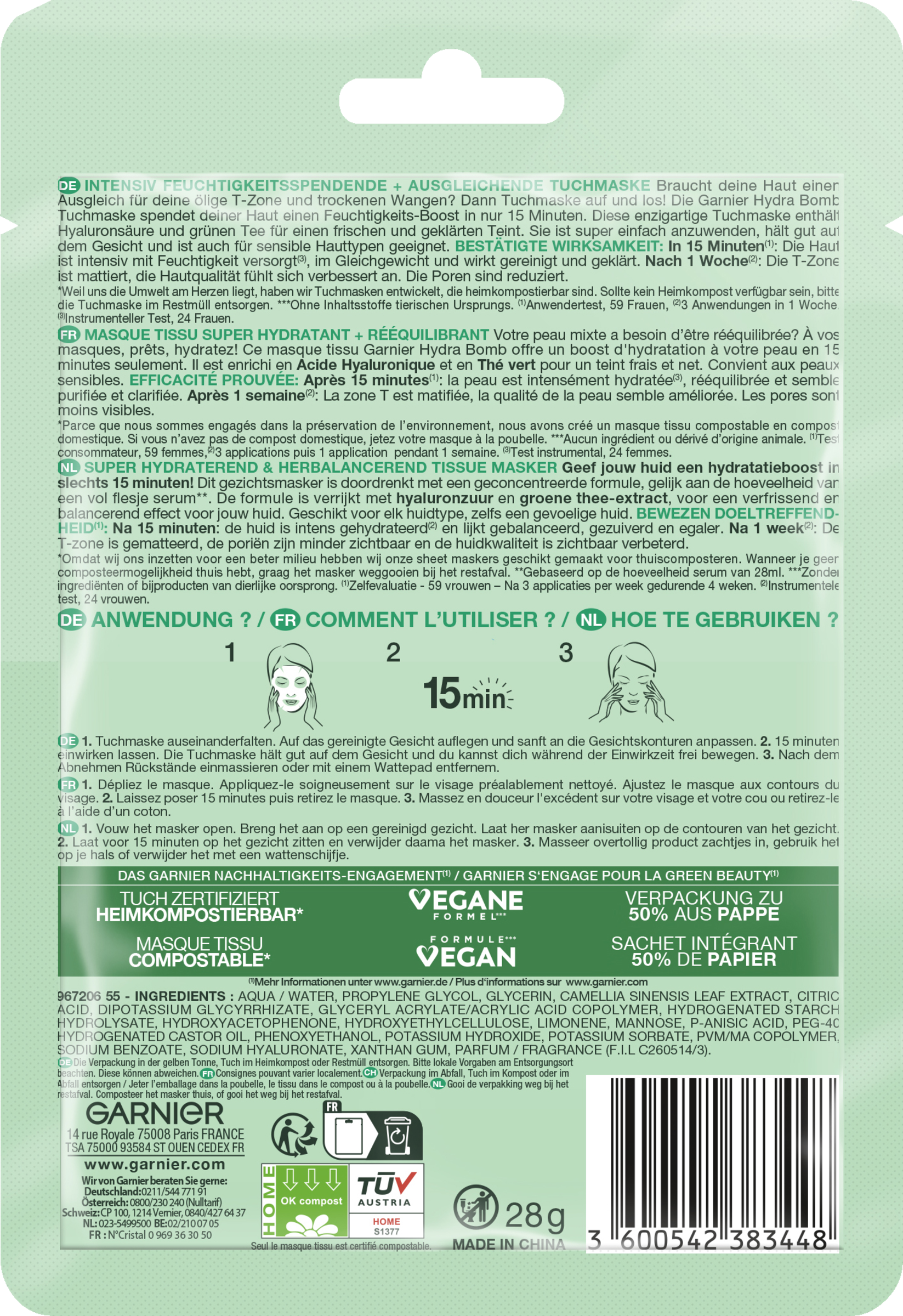Die Garnier SkinActive Hydra Bomb Tuchmaske wurde speziell für die Bedürfnisse von normaler und Mischhaut entwickelt. Dank enthaltener Hyaluronsäure und grünem Tee sorgt die Tuchmaske für die optimale Gesichtspflege von einer öligen T-Zone und trockenen Wangen. Die Maske verleiht einen Feuchtigkeitsboost in nur 15 Minuten und hinterlässt gleichzeitig einen frischeren und geklärten Teint. Nach nur einer Woche ist die T-Zone mattiert, die Hautqualität fühlt sich verbessert an und auch die Poren sind reduziert – für eine hydratisierte und ausgeglichene Haut, die wieder in das Gleichgewicht gebracht wurde.