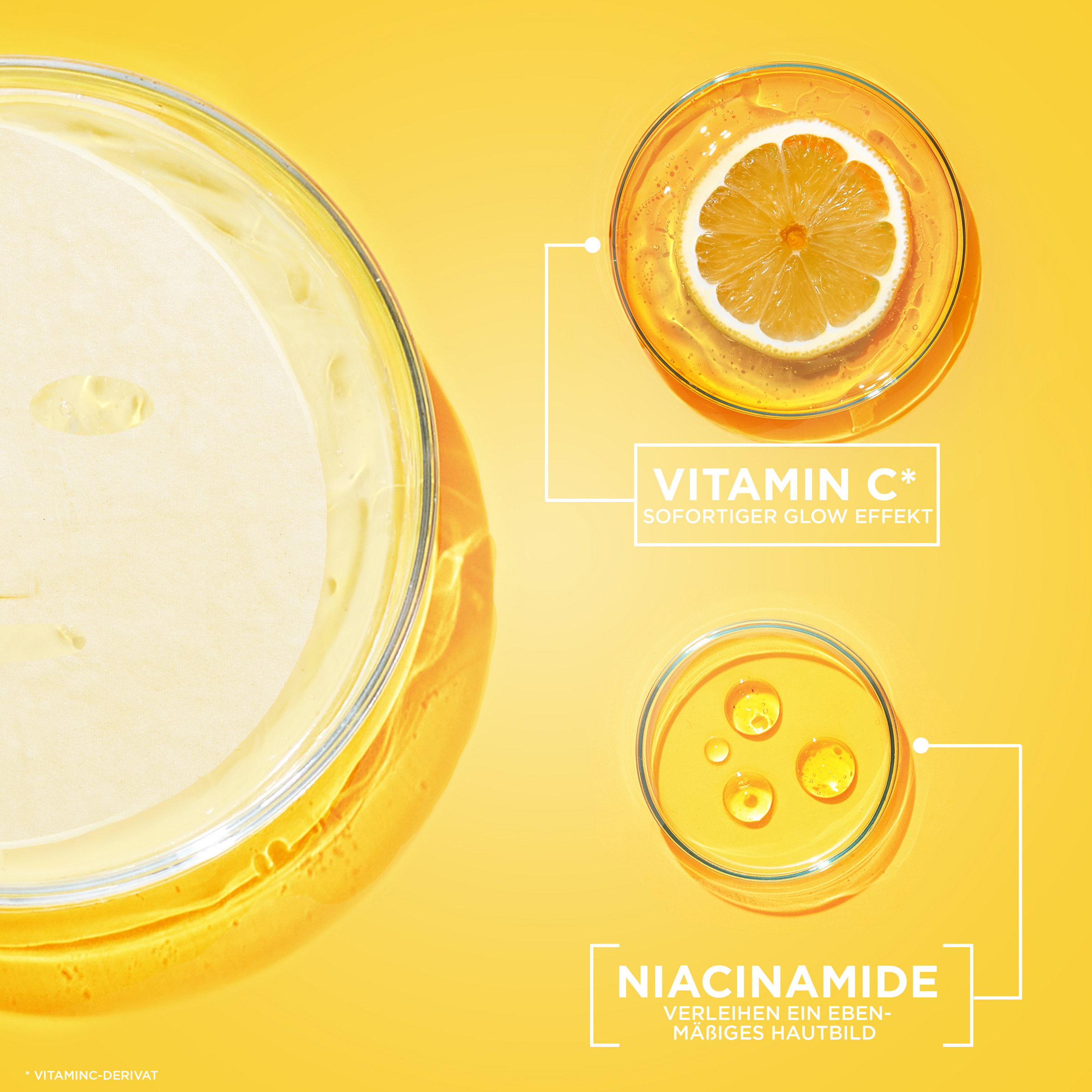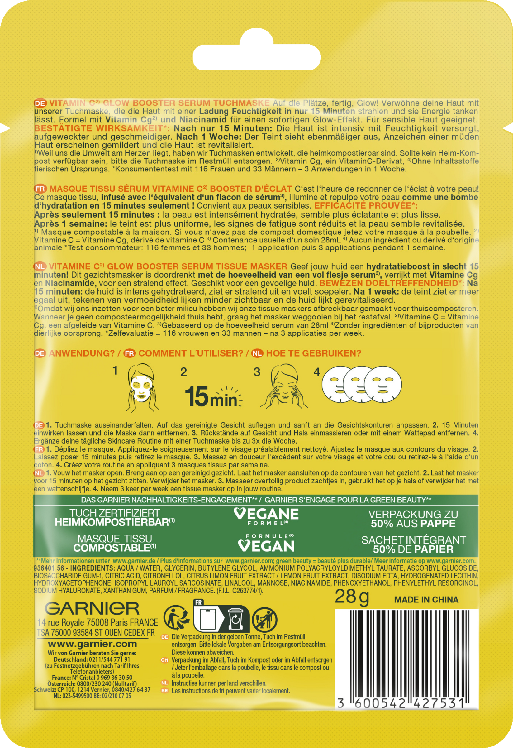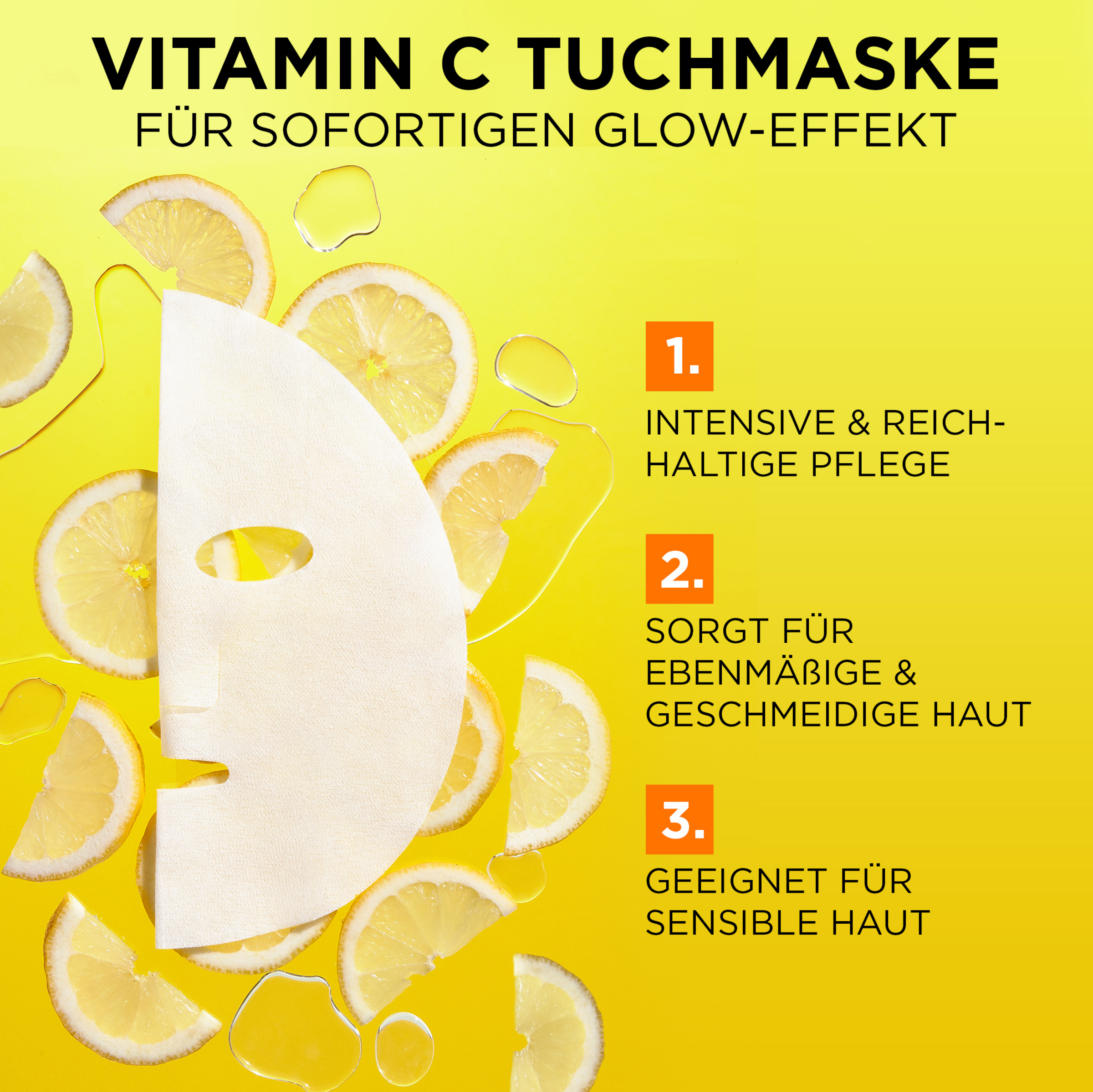 Die Garnier SkinActive Vitamin C Tuchmaske wirkt den Anzeichen müder Haut entgegen. Die reichhaltige Formel ist mit Vitamin C und Hyaluronsäure angereichert. Diese wirkungsvolle Kombination lässt die Haut strahlen – für einen sofortigen Glow-Effekt. Bereits nach der ersten Anwendung erscheint die Haut sichtbar aufgeweckter, geschmeidiger und ebenmäßiger. Zusätzlich wird die Haut mit wichtiger Feuchtigkeit versorgt, wodurch sie an Energie gewinnt und revitalisiert wird. Die Vitamin C Tuchmaske eignet sich auch optimal für sensible Haut.