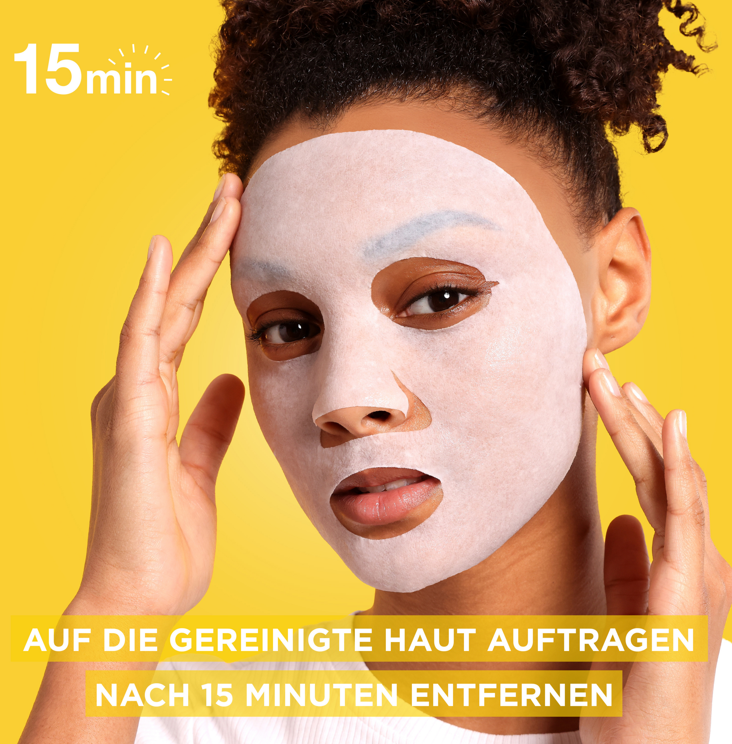 Zuerst die Tuchmaske auseinanderfalten, auf das gereinigte Gesicht legen und sanft an die Konturen anpassen. Dann die Vitamin C Tuchmaske 15 Minuten einwirken lassen. Nach der Einwirkzeit die Tuchmaske aus dem Gesicht entfernen. Mögliche Rückstände, die auf der Haut verblieben sind, können einmassiert oder mit einem Wattepad abgenommen werden.