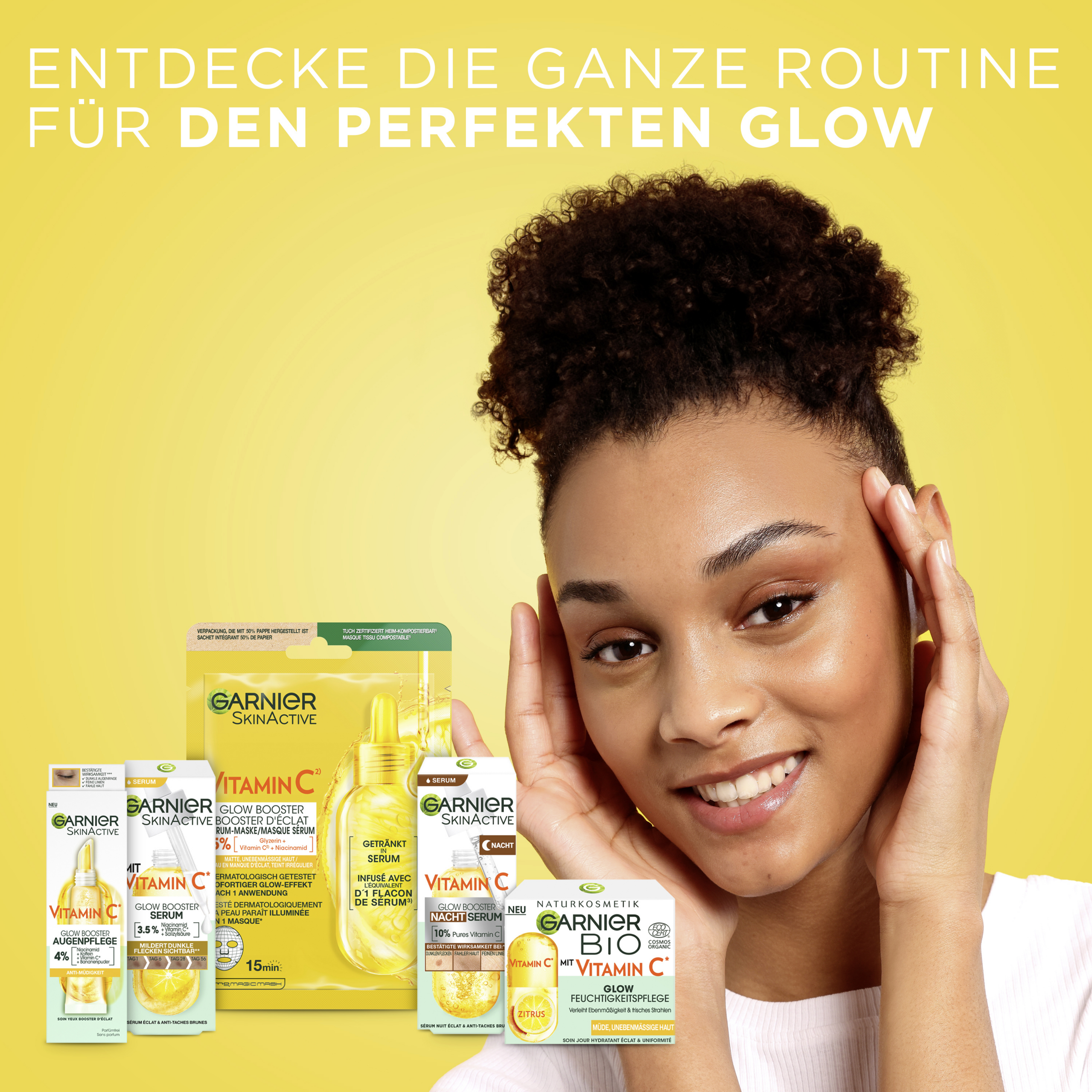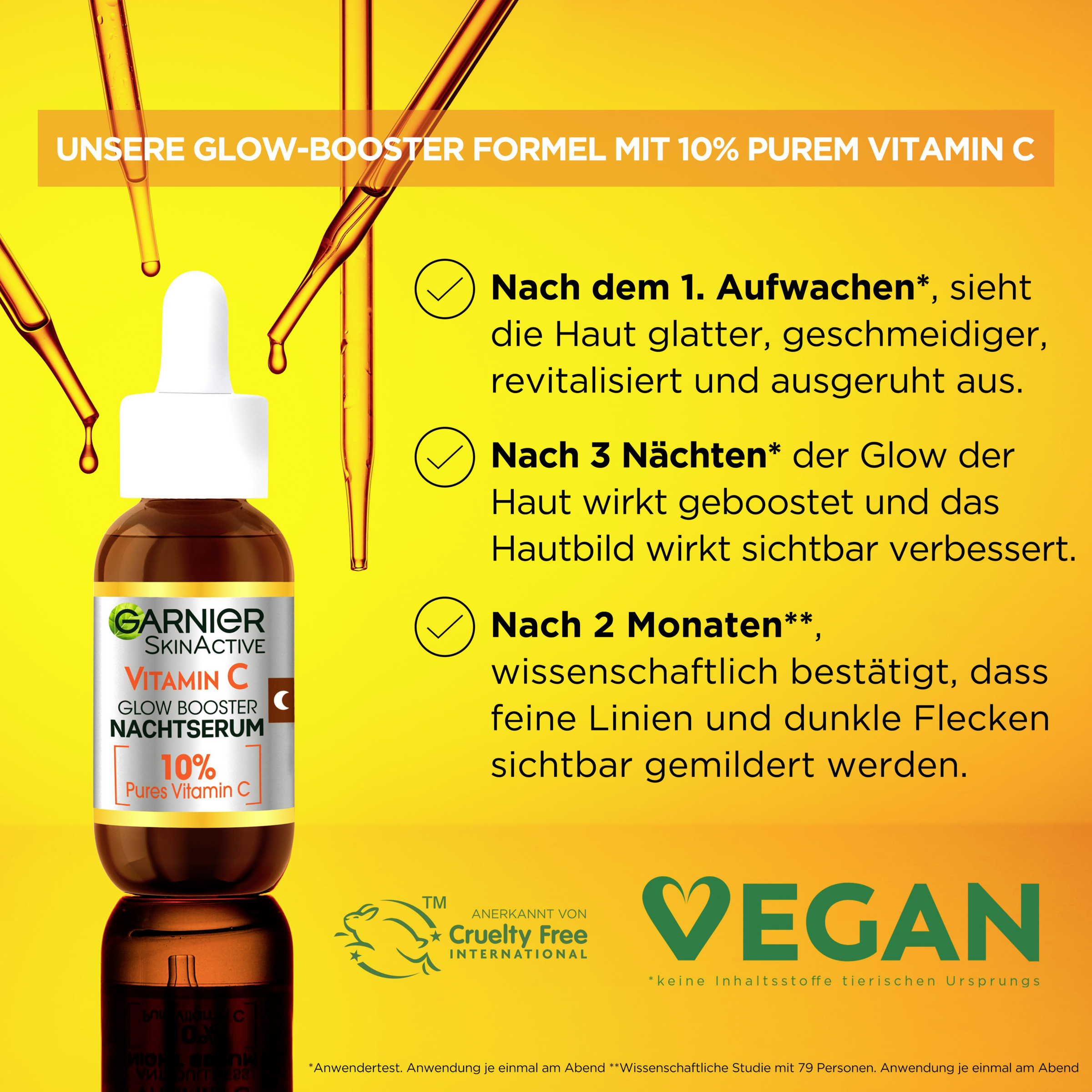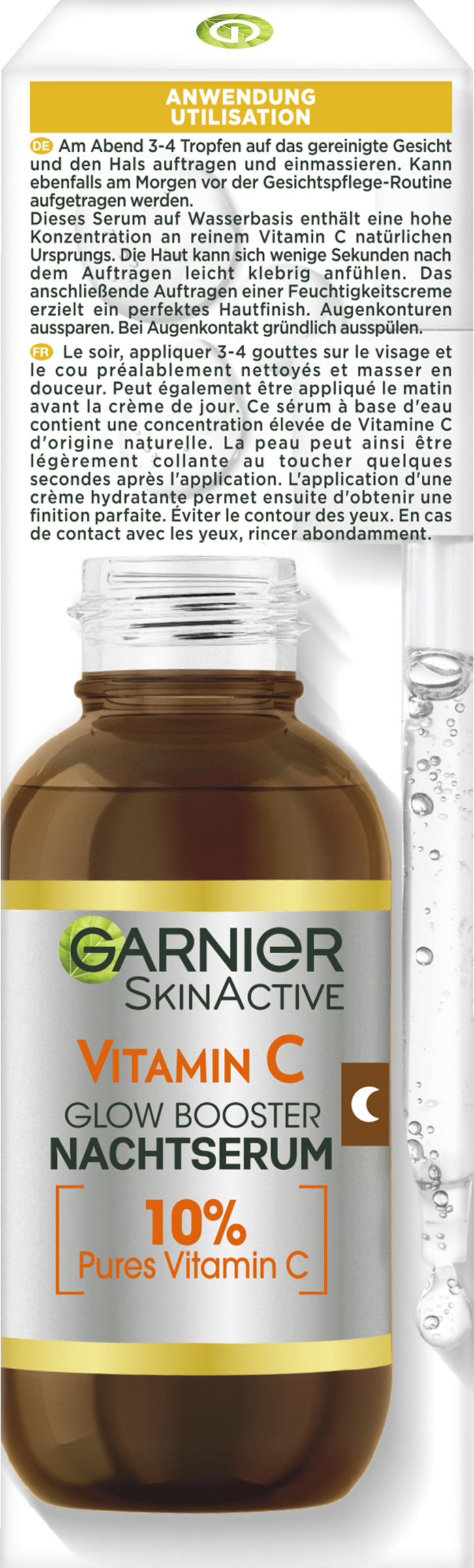 Das Garnier SkinActive Vitamin C Glow Booster Nachtserum fördert die Hautregeneration im Schlaf. Die hochkonzentrierte Formel enthält 10% pures Vitamin C natürlichen Ursprungs sowie Hyaluronsäure. Schon nach der ersten Nacht wirkt die Haut glatter, geschmeidiger und ausgeruhter. Durch den Glow-Booster erscheint der Teint verbessert. Nach zwei Monaten werden feineLinien und dunkle Flecken sichtbar gemildert. Außerdem steht das Serum ganz im Sinne des Garnier Nachhaltigkeits-Engagements: Die Formel ist vegan, der Flaschenkörper besteht aus 25% recyceltem Glas und die produzierende Fabrik nutzt 100% erneuerbare Energien.