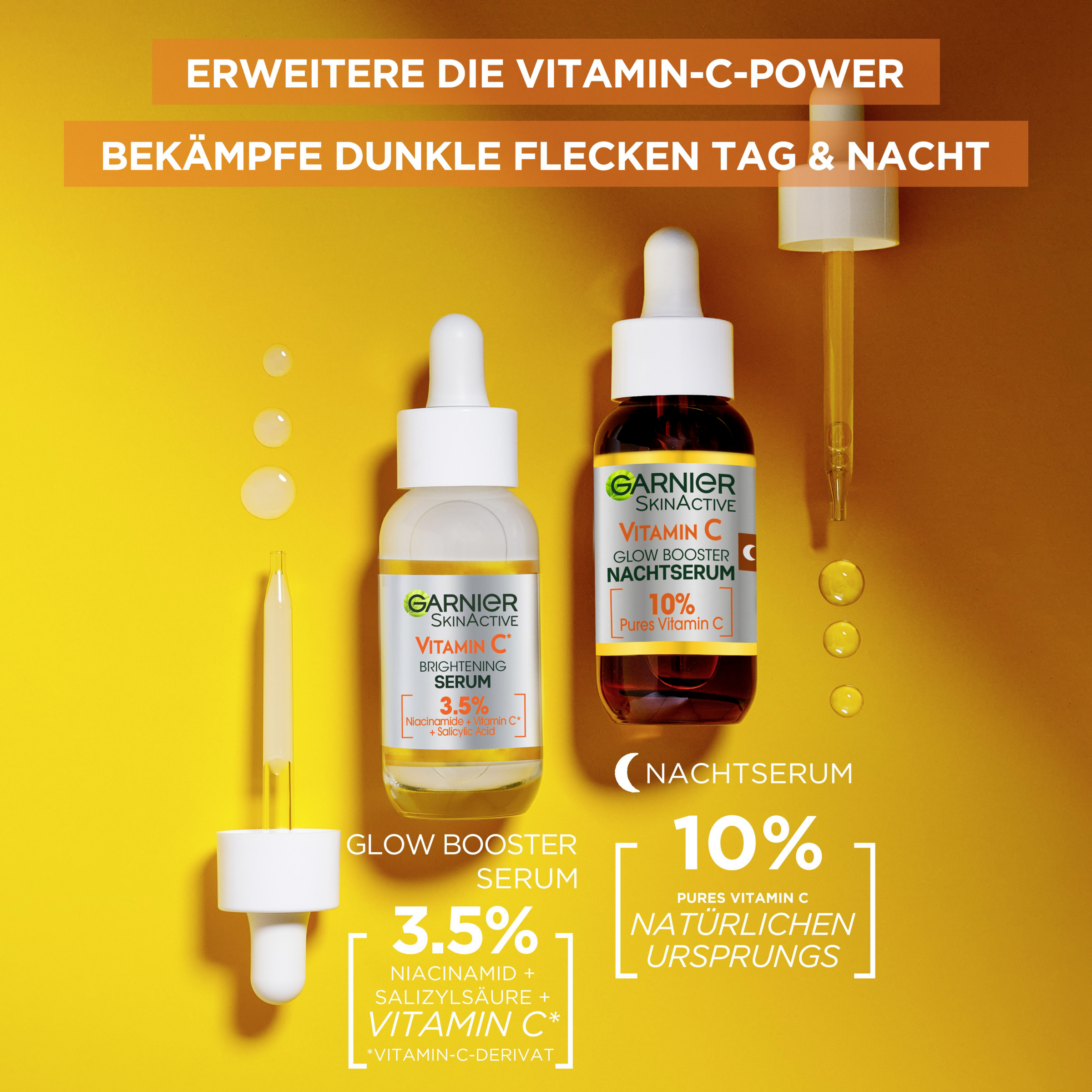 Das Garnier SkinActive Vitamin C Glow Booster Nachtserum mit 10% purem Vitamin C sowie Hyaluronsäure sorgt für strahlendere, gleichmäßigere und glattere Haut.