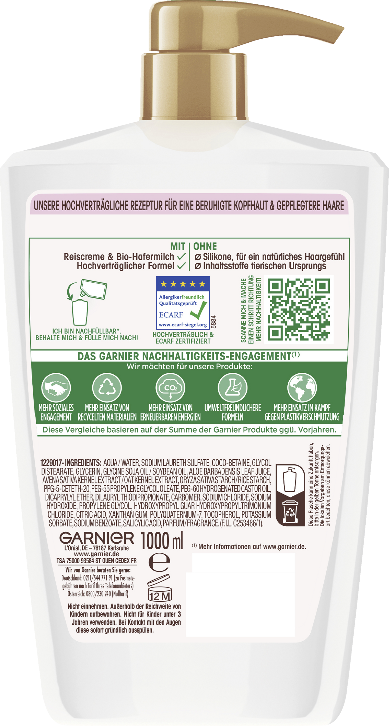 Garnier Wahre Schätze Beruhigendes Shampoo Sanfte Hafermilch nährt und verwöhnt empfindliches Haar intensiv – vom Ansatz bis in die Spitzen. Das Shampoo vereint Reiscreme und Bio-Hafermilch in einer cremig-sanften Pflegerezeptur für besonders geschmeidiges Haar. Die Hafermilch ist für ihre beruhigende Wirkung auf die empfindliche und juckende Kopfhaut bekannt; während die Reiscreme pflegende, schützende und feuchtigkeitsspendende Eigenschaften besitzt. Die hochverträgliche Formel wurde durch ECARF zertifiziert. Für eine beruhigte Kopfhaut und gepflegtere Haare.