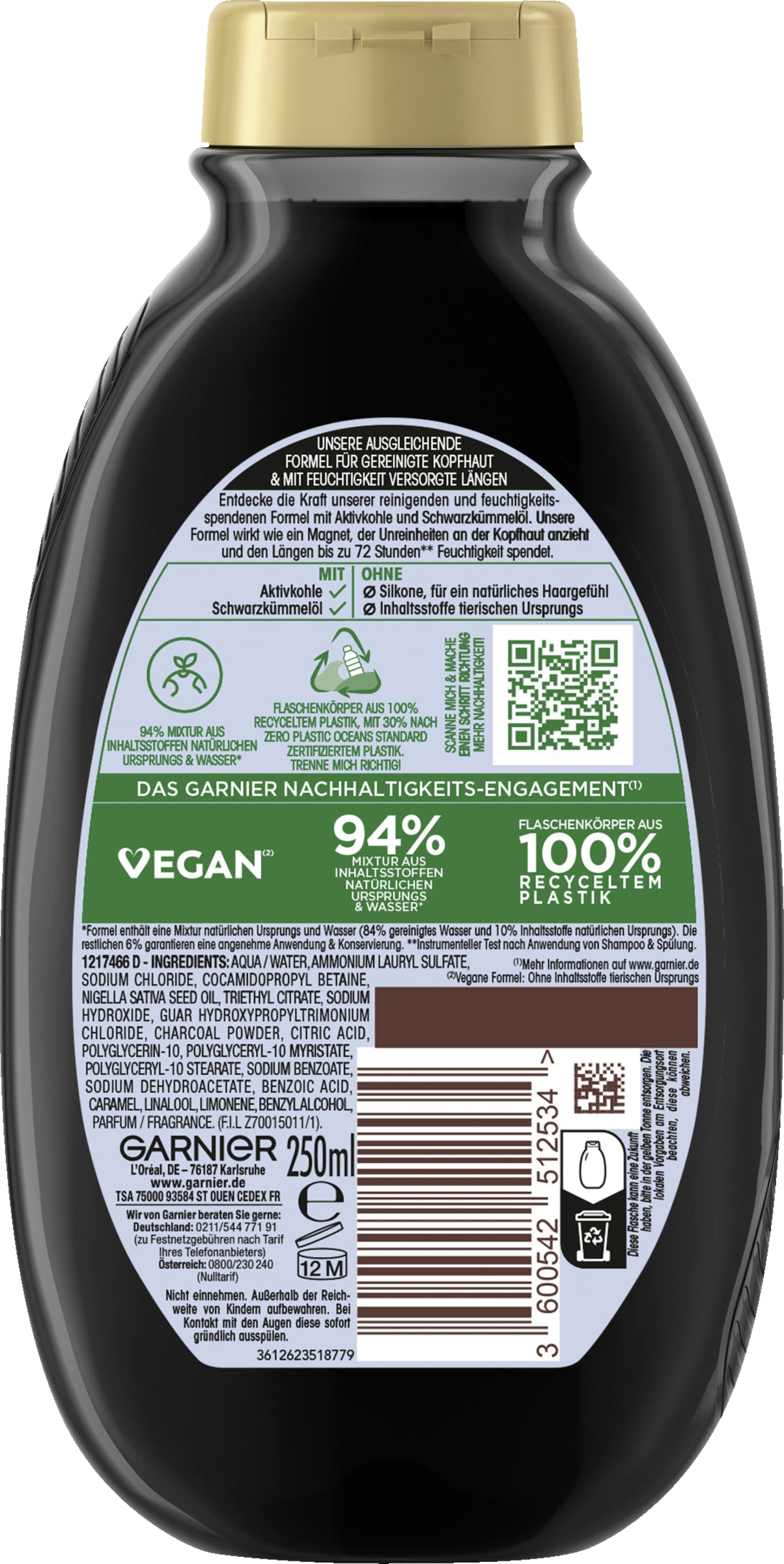 1217466 D - Aqua / Water • Ammonium Lauryl Sulfate • Sodium Chloride • Cocamidopropyl Betaine • Nigella Sativa Seed Oil • Triethyl Citrate • Sodium Hydroxide • Guar Hydroxypropyltrimonium Chloride • Charcoal Powder • Citric Acid • Polyglycerin-10 • Polyglyceryl-10 Myristate • Polyglyceryl-10 Stearate • Sodium Benzoate • Sodium Dehydroacetate • Benzoic Acid • Caramel • Linalool • Limonene • Benzyl Alcohol • Parfum / Fragrance (F.I.L. Z70015011/1).