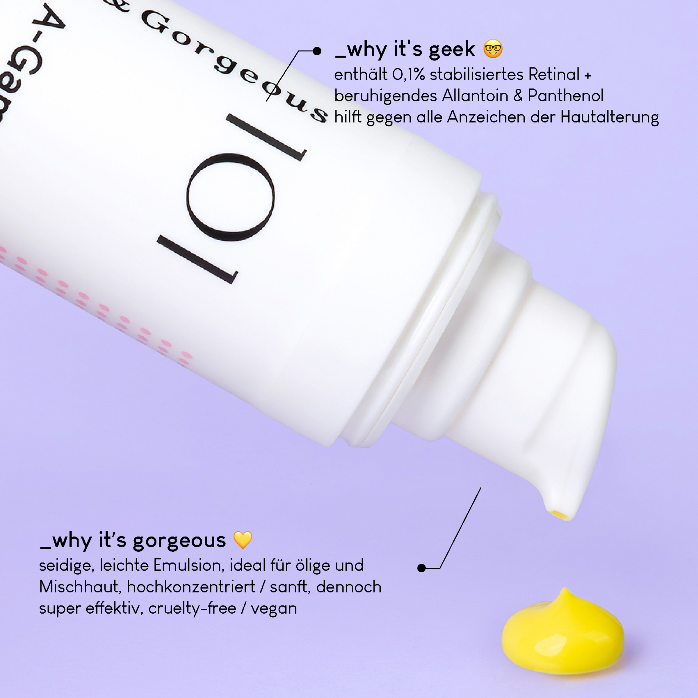 A-Game 10 ist ein starkes Retinal-Serum mit 0,1% Retinal, das ersten Alterungsanzeichen der Haut entgegenwirkt. Retinal wird aus Vitamin A gebildet und regt die Kollagenproduktion der Haut an. Dadurch gewinnt die Haut an Elastizität und Jugendlichkeit. Gleichzeitig wird der Erneuerungsprozess der oberen Hautschichten beschleunigt, sodass die Haut glatter und ebenmäßiger wirkt.