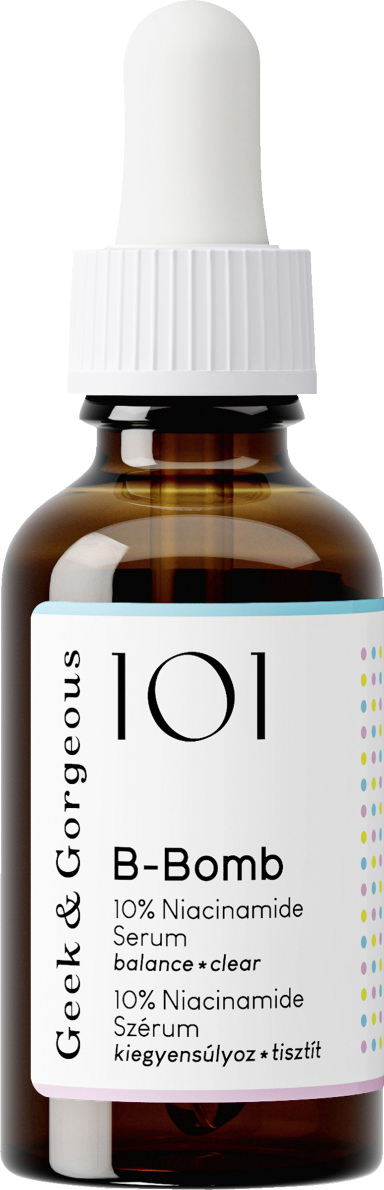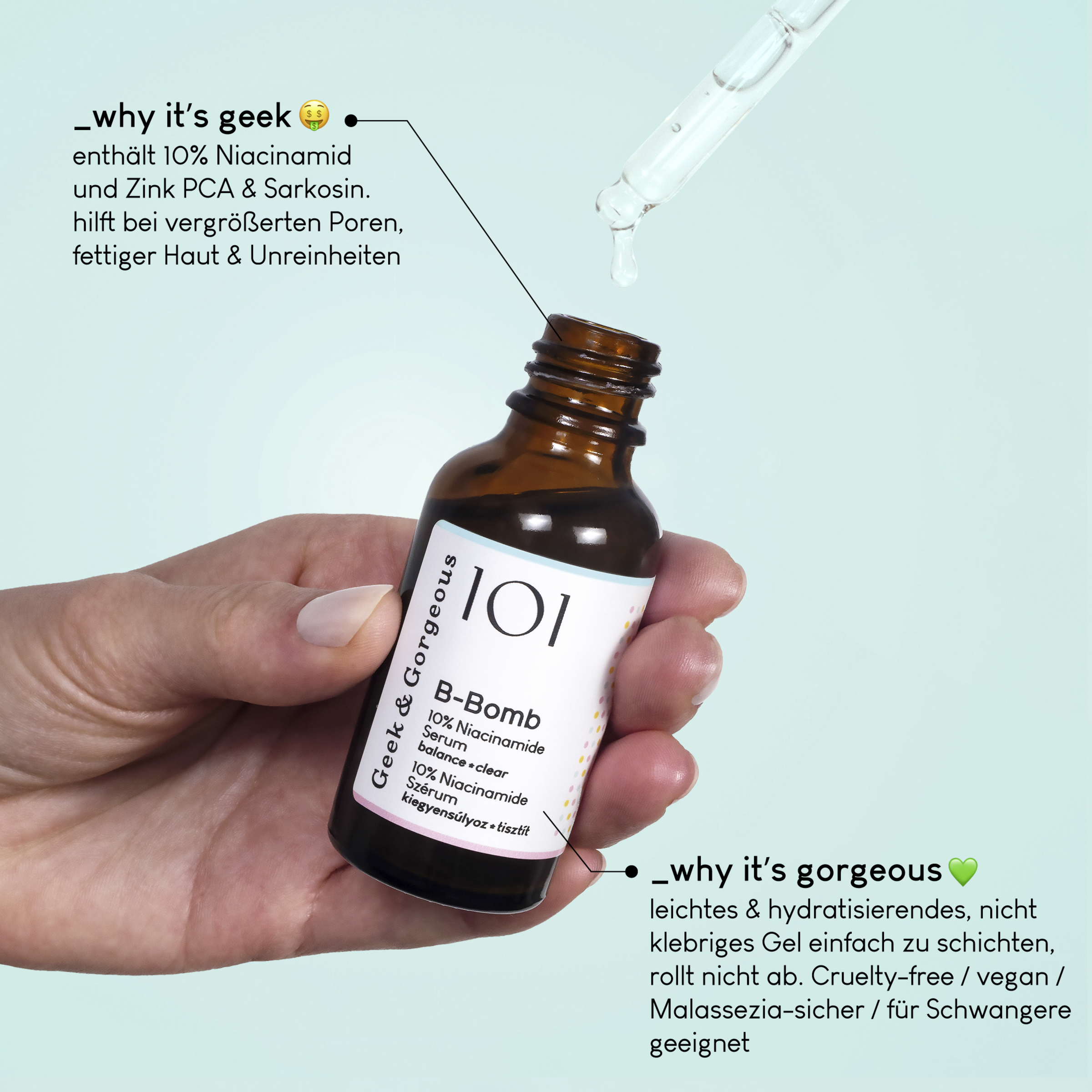 B-Bomb ist ein leichtes, hydratisierendes Serum mit 10% Niacinamid, das fettiger Haut, vergrößerten Poren und Pigmentflecken entgegenwirkt. Niacinamid ist ein hochwirksamer Inhaltsstoff mit vielseitigen Eigenschaften. Er reduziert die Talgproduktion der Haut und wirkt porenverfeinernd. Außerdem beruhigt er zu Akne neigende Haut und stärkt die Hautbarriere. Darüber hinaus mildert er Pigmentflecken, wodurch die Haut ebenmäßiger und strahlender aussieht. B-Bomb enthält neben 10% Niacinamid auch Zink PCA und Sarkosin.