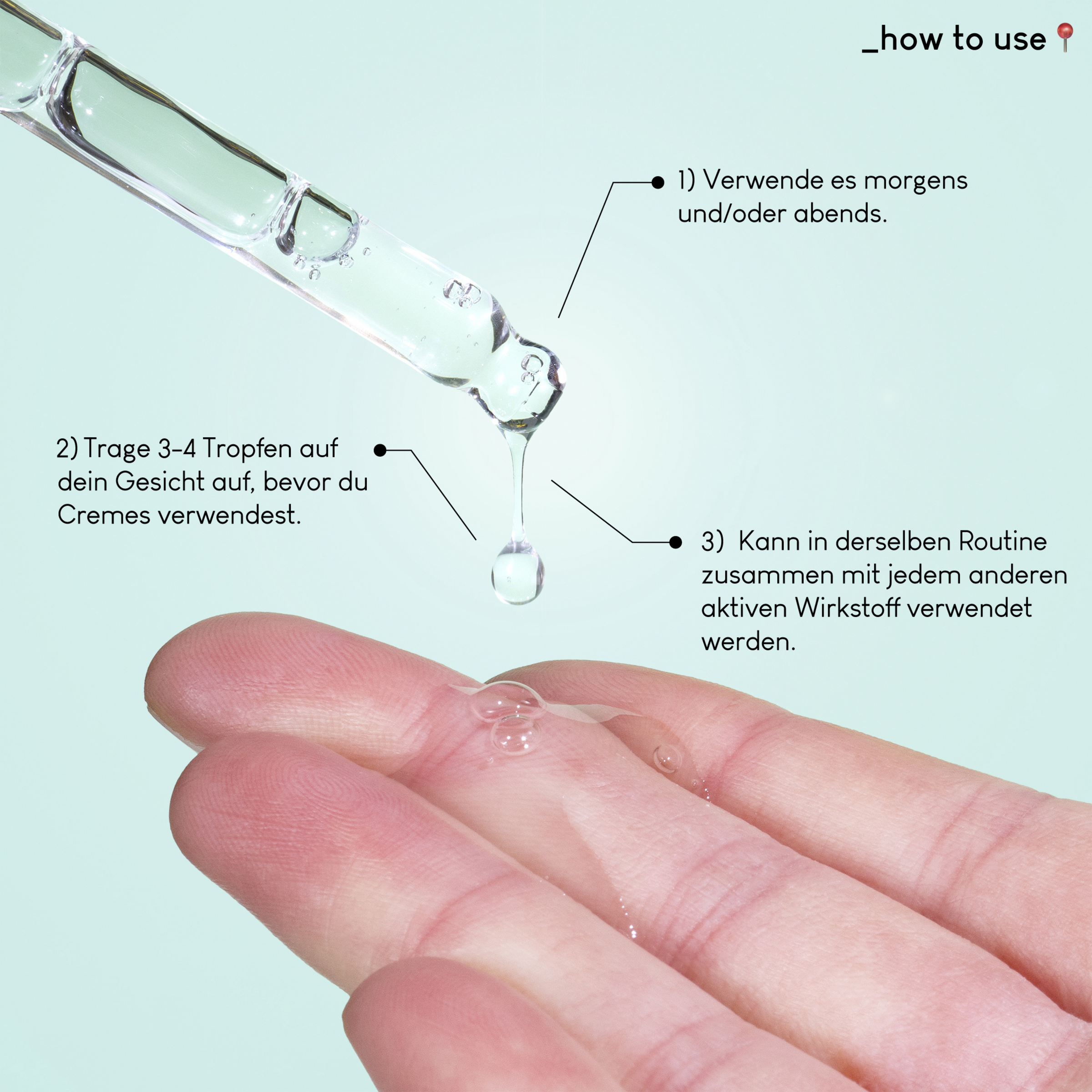 Ein paar Tropfen auf dem Gesicht nach der Reinigung (und Gesichtswasser und Peeling) auftragen, aber vor dem Auftragen von Emulsionen und/oder Cremes. Kann entweder morgens und/oder abends benutzt werden. Kann einzeln verwendet werden oder in Kombination mit einem anderen Produkt als Niacinamid-Booster. Nicht in direkte Säuren, wie peelende Säuren oder pures Vitamin C, mischen.
