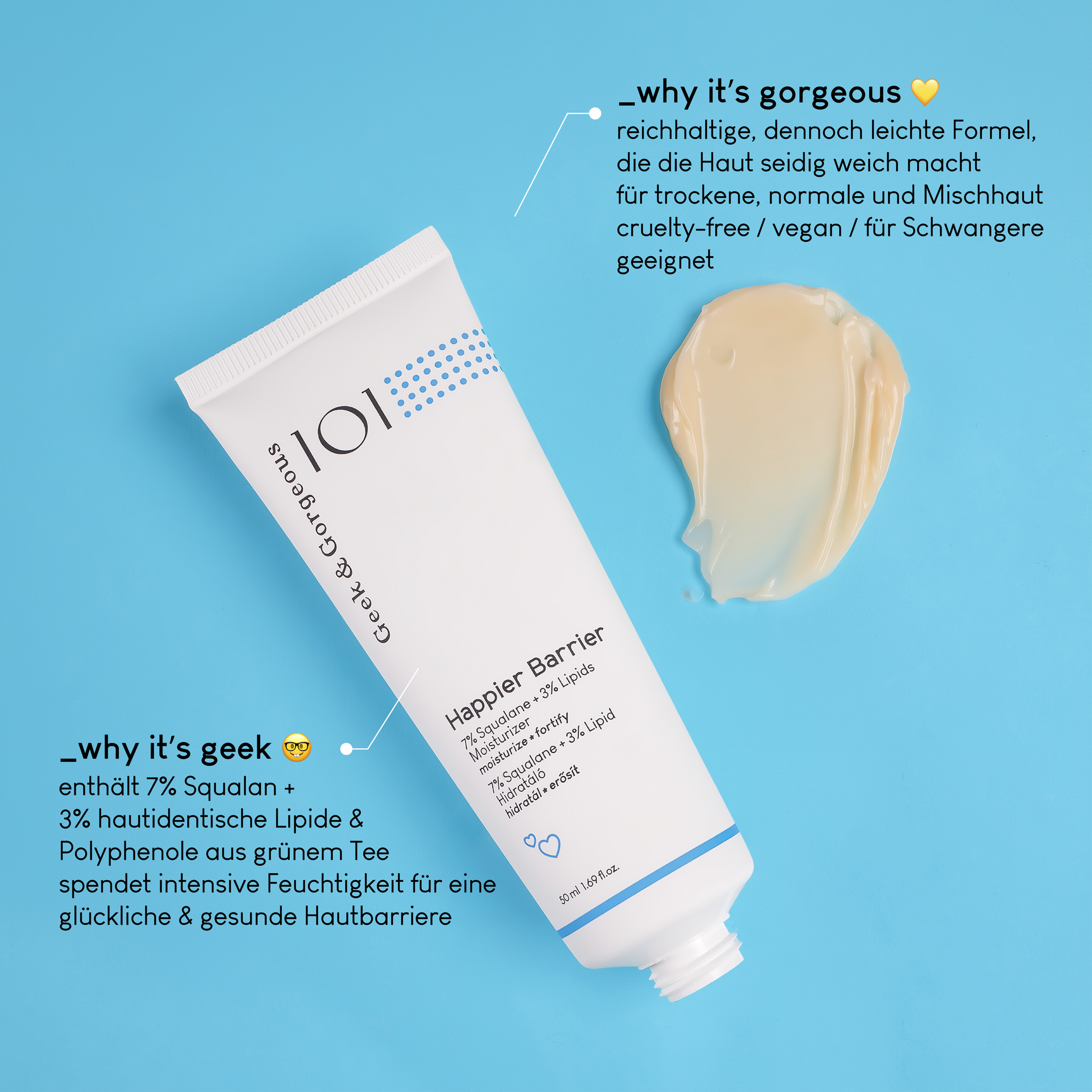 Happier Barrier ist eine intensiv nährende Feuchtigkeitscreme mit leichter Textur. Die Creme fördert nachhaltig eine starke und gesunde Hautbarriere. Sie hydratisiert die Haut effektiv und pflegt sie weich und glatt. Happier Barrier enthält 7% Squalan, 3% hautidentische Lipide, 0,1% pure Ceramide sowie Grüntee-Extrakt. Während Squalan die Haut mit Feuchtigkeit versorgt und sie seidig-weich macht, reparieren und hydratisieren hautidentische Lipide die Hautbarriere. Die hautidentischen Lipide setzen sich unter anderem aus Jojoba-, Macadamia- und Olivenöl zusammen und stellen einen eigenen, patentierten Wirkstoff-Komplex dar, der die Lipide imitiert, die auf junger und gesunder Haut vorkommen. 0,1% pure Ceramide stärken und schützen die Hautbarriere zusätzlich.