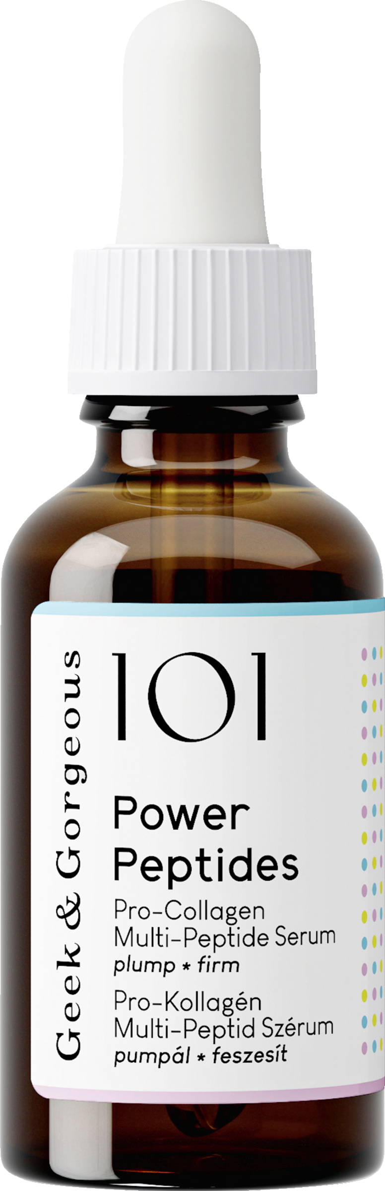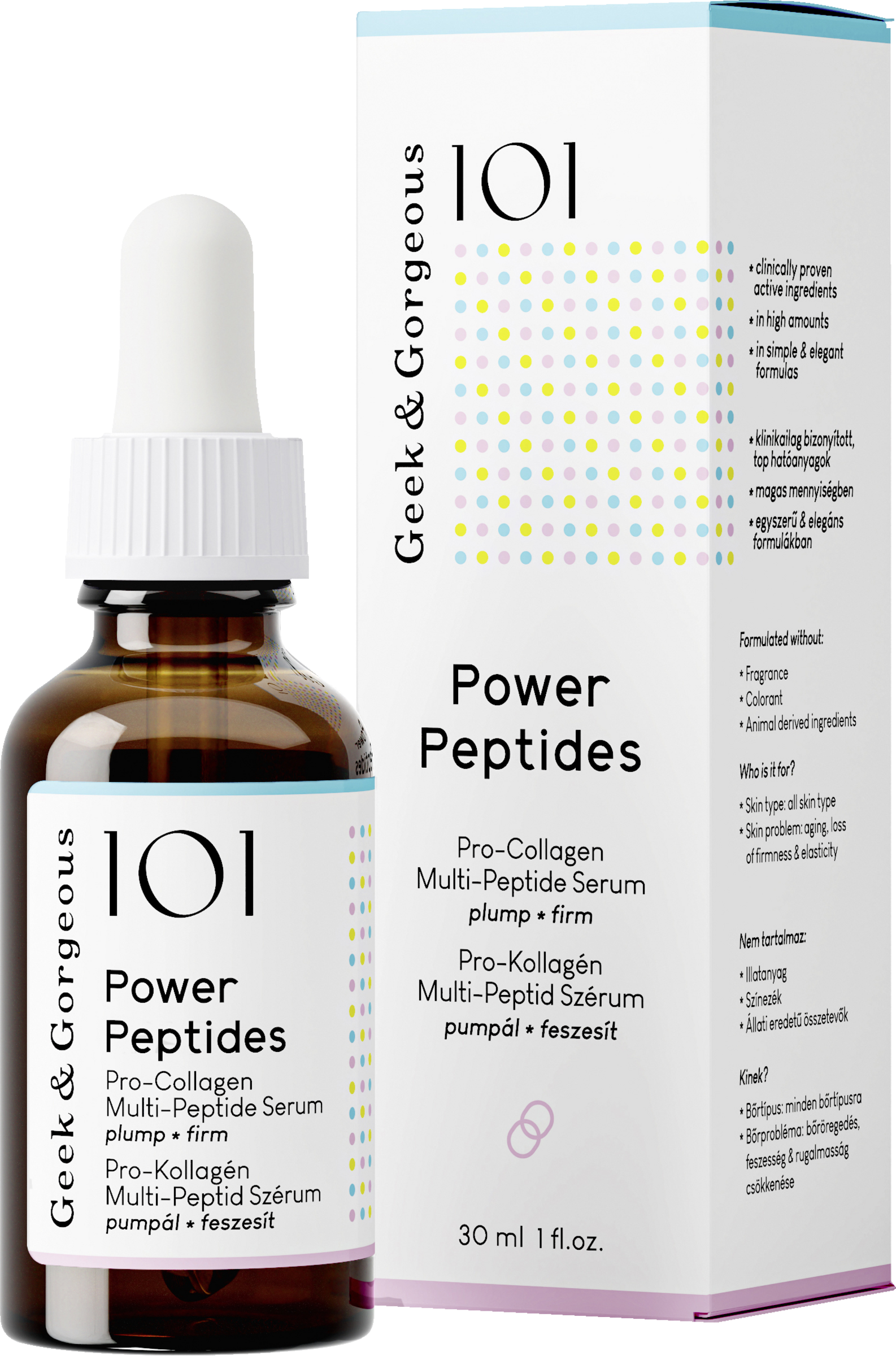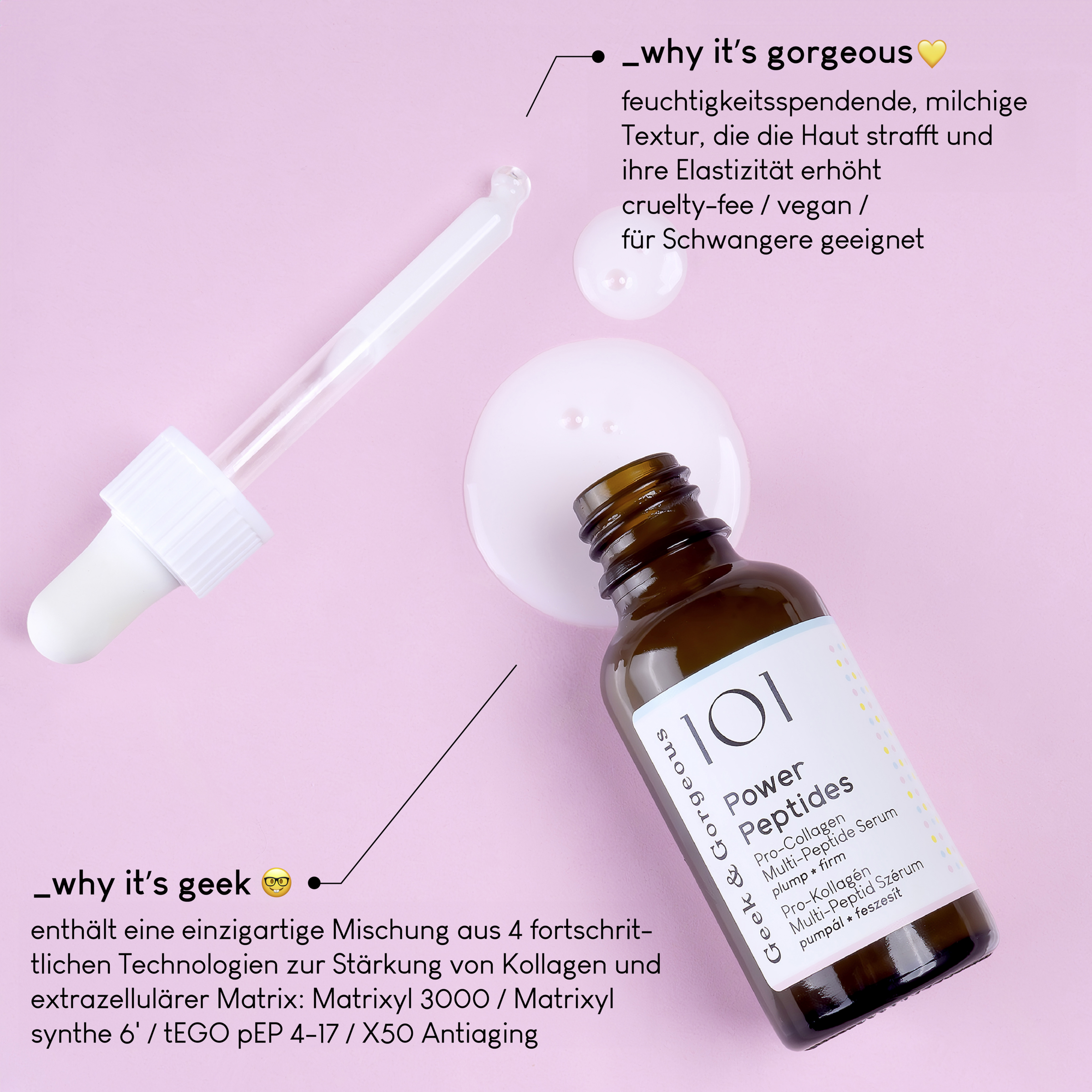 Power Peptides ist ein milchiges Serum mit vier wirkungsvollen Peptiden, die der Haut zu mehr Spannkraft verhelfen und für ein jünger aussehendes Hautbild beitragen. Das 3% Matrixyl 3000 (Palmitoyl Tripeptide-1 + Palmitoyl Tetrapeptide-7) ist ein bewährtes Duo zur Faltenreduzierung, das der Haut ein jüngeres Aussehen verleiht, indem es Falten minimiert, die Elastizität verbessert, den Hautton ausgleicht und einen sichtbaren Lifting-Effekt erzeugt. Das 2% Matrixyl synthe’6 (Palmitoyl Tripeptide-38) stimuliert die Produktion von sechs wichtigen Hautkomponenten (Kollagen I, III, IV, Fibronektin, Hyaluronsäure und Laminin 5) und reduziert effektiv Falten auf der Stirn und im Augenbereich (Krähenfüße). Das TEGO® PEP 4-17 (Tetrapeptide-21) ist ein wirksames Peptid, das die Produktion von hauteigenen Stoffen wie Kollagen, Hyaluronsäure und Fibronektin anregt und so die Haut elastischer und weicher macht. Das X50 Antiaging (Copper Palmitoyl Heptapeptide-14) ist bereits in geringen Konzentrationen hochwirksam gegen erste Anzeichen der Hautalterung. Dank seines doppelten Peptid-Aufbaus wird es besonders schnell und gezielt zu den Zellen transportiert, die für die Kollagenproduktion verantwortlich sind.