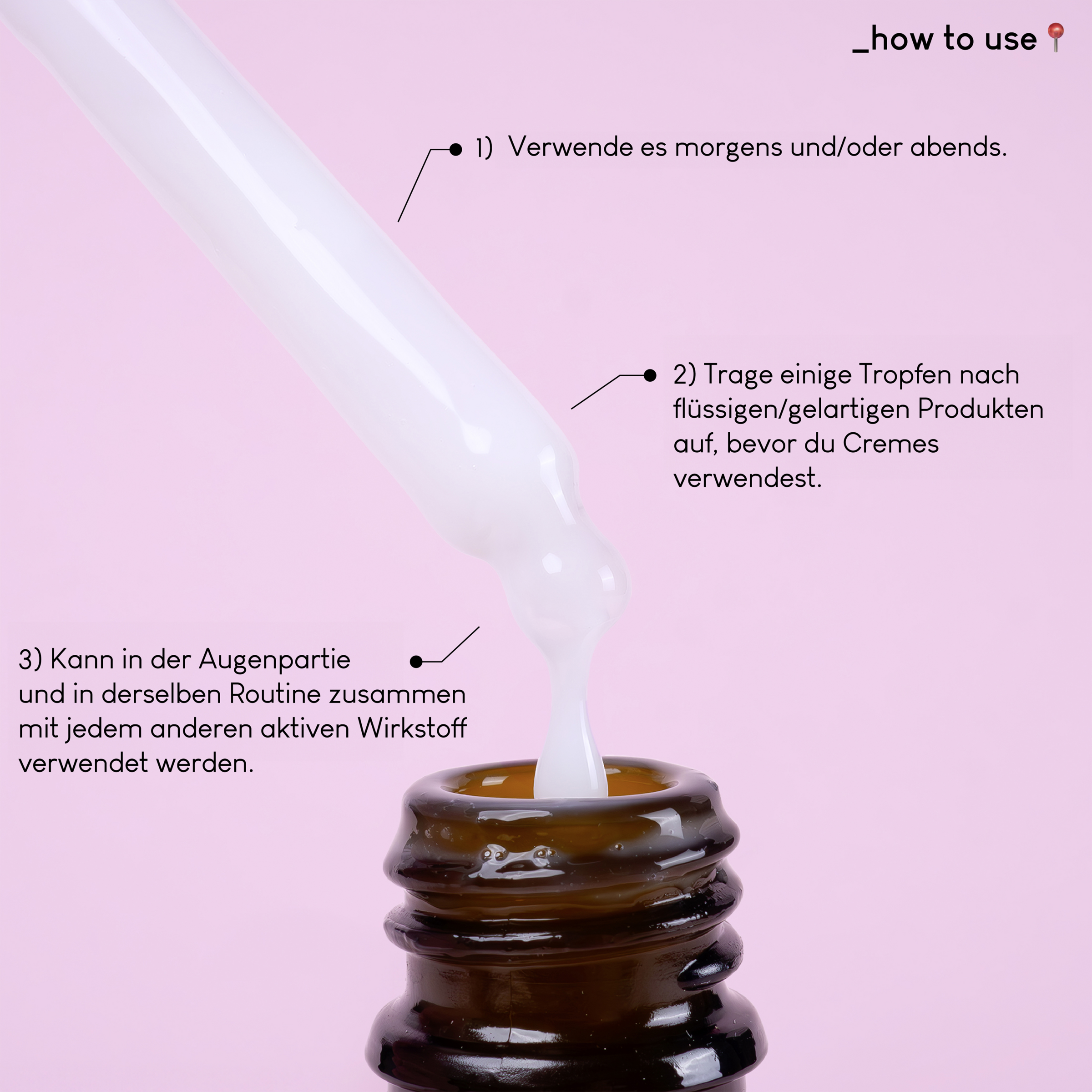 Ein paar Tropfen auf dem Gesicht, inklusive der Augenpartie, nach der Reinigung (und nach flüssigen und gelartigen Texturen) auftragen, aber vor der Verwendung von Cremes. Kann morgens und/oder abends verwendet und mit aktiven Wirkstoffen kombiniert werden.