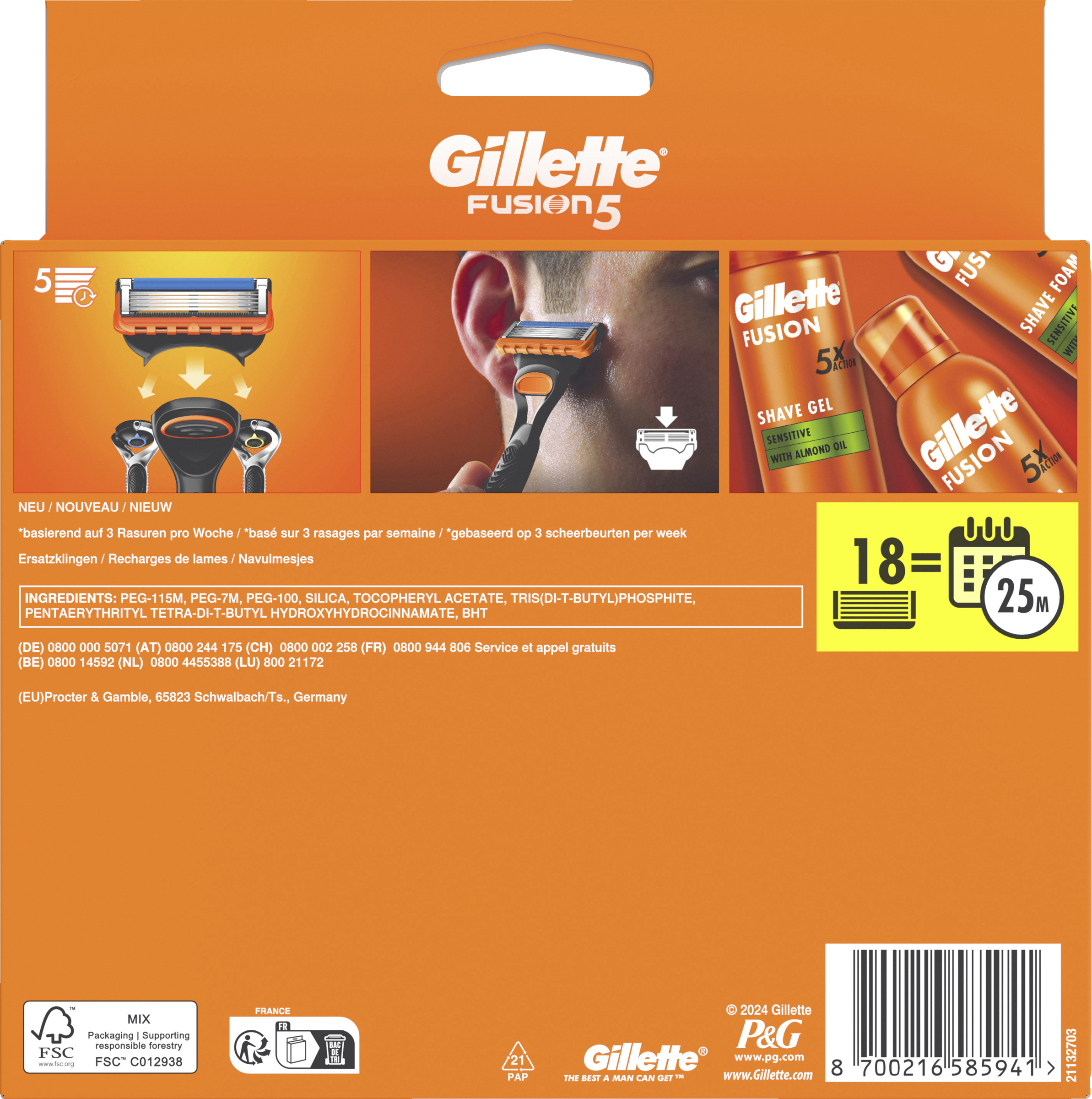 Erlebe eine unglaublich gründliche und komfortable Rasur mit den Gillette Fusion5 Ersatzklingen für Männer. Die Ersatzklingen verfügen über 5 scharfe Klingen, die für eine glatte und angenehme Rasur sorgen. Die Fusion5 Rasierklingen verfügen über einen größeren Gleitstreifen für ein sanfteres Gleiten (im Vergleich zum vorherigem Fusion5), was den Komfort Deines Rasurerlebnisses erhöht. Jede Ersatzklinge bietet bis zu 20 Rasuren (*basierend auf 3 Rasuren pro Woche). Die Klingen beinhalten auch einen Präzisionstrimmer für schwer erreichbare Stellen. Mit einem Microfin Guard, der die Haut vor der Rasur glättet, und einem Mikrokamm, der die Haare in Richtung der Klingen leitet, sorgt dieser Rasierer für ein effizientes Rasurerlebnis. Für optimale Ergebnisse kombinieren Sie es mit Gillette Fusion Pro Sensitive Cooling Gel.