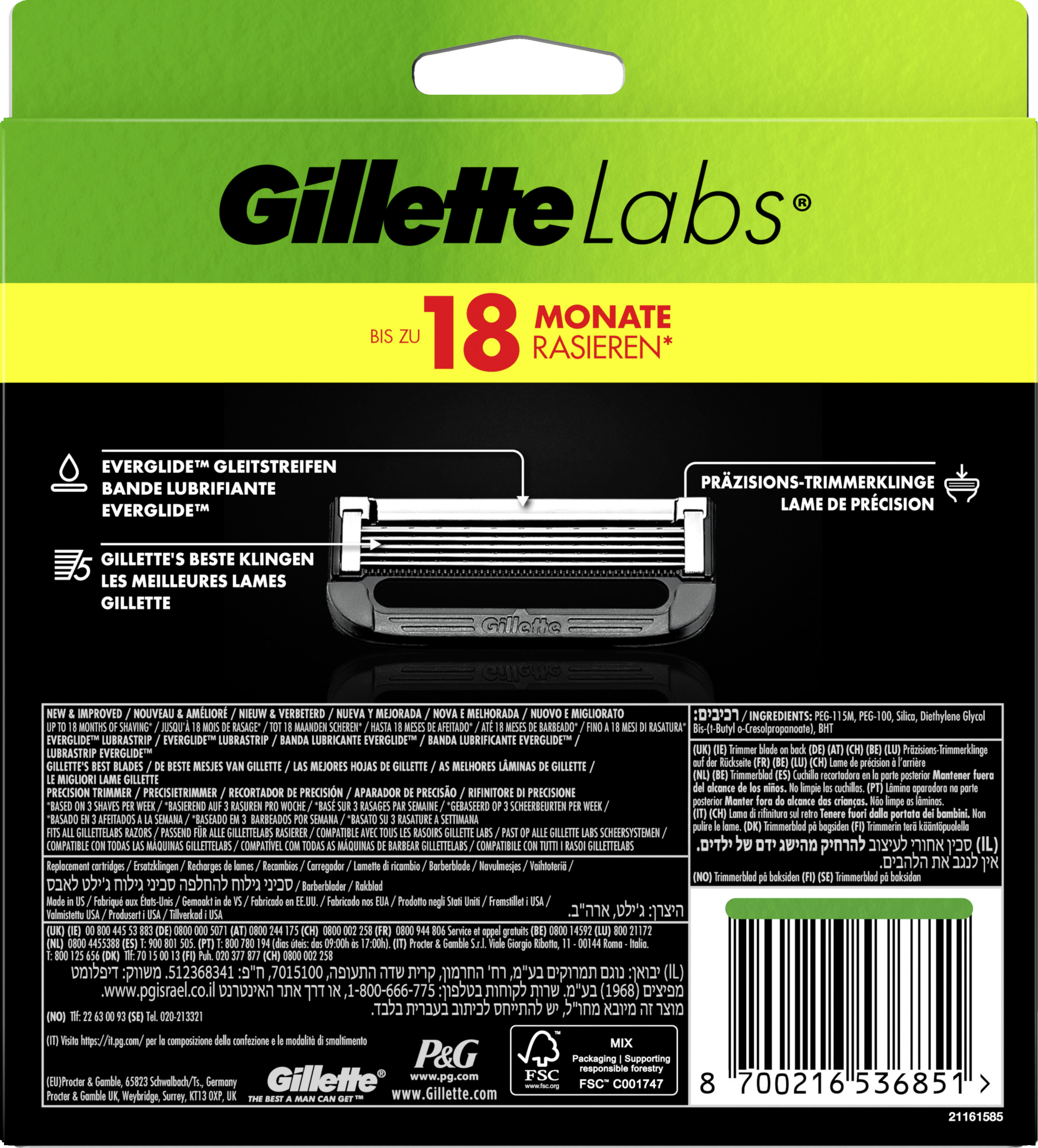 - GilletteLabs Klingen halten bis zu 30 Rasuren pro Ersatzklinge und damit bis zu 50% länger als Fusion