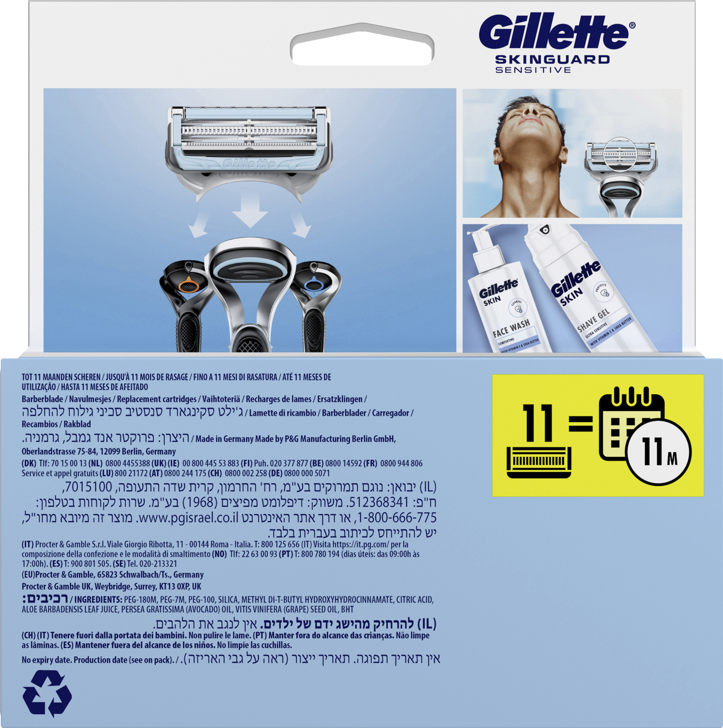 Die Gillette SkinGuard Sensitive Ersatzklingen wurden speziell für die Rasur auf unebener, unreiner und irritierter Haut entwickelt. Die einzigartige SkinGuard-Technologie schützt die Haut vor dem Klingenkontakt und hilft so, Hautirritationen zu reduzieren. Außerdem verhindern die beiden Klingen mit geringer benötigter Schnittkraft ein Ziehen und Reißen der Haare.