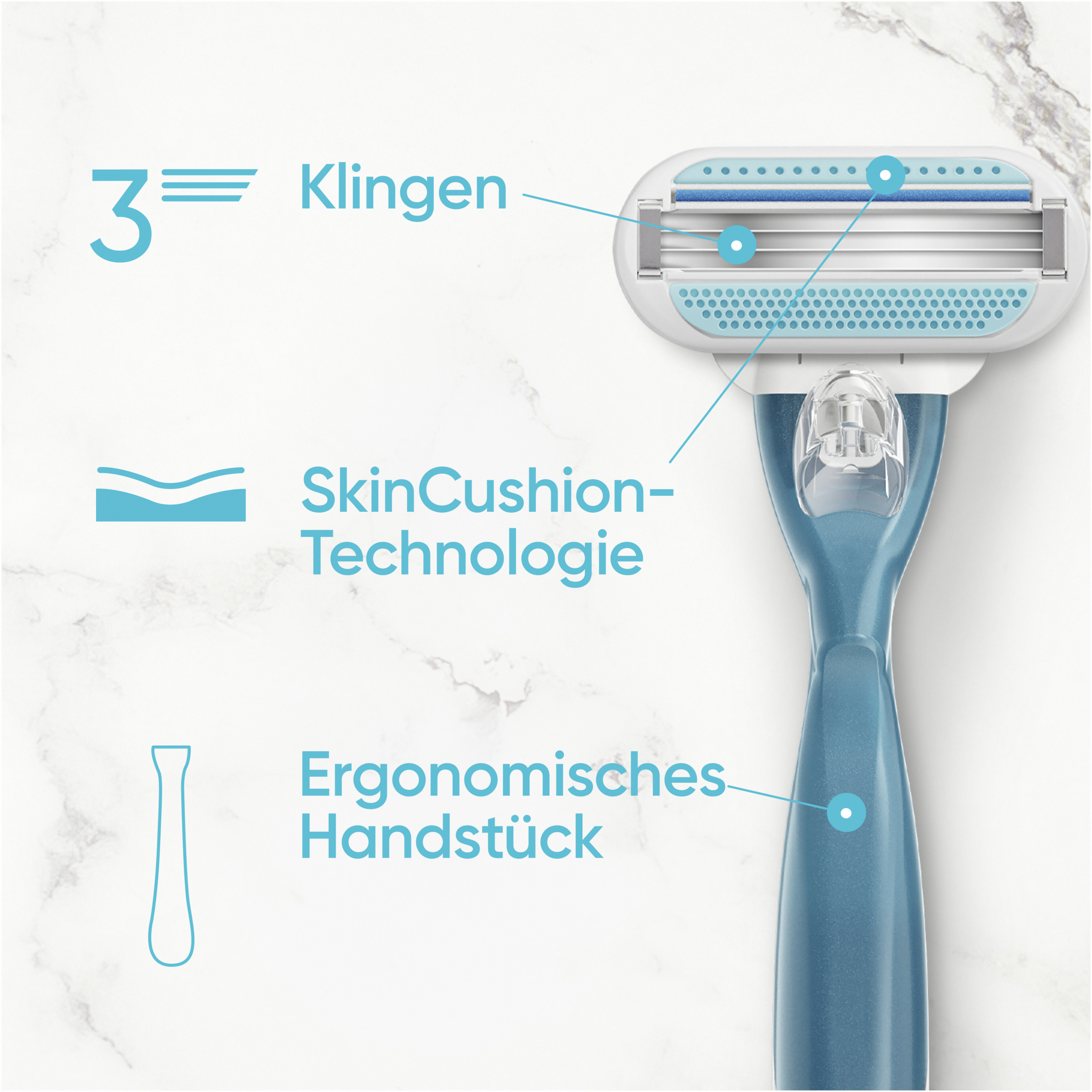 Schenke Deiner empfindlichen Haut, die verwöhnende Glätte, die sie verdient. Diese Ersatzklinge wurde für deine einzigartigen Hautbedürfnisse entwickelt. Unsere Smooth Ersatzklingen sind mit 3 ultra scharfen Klingen ausgestattet, die eine schnelle und gründliche Rasur ermöglichen. Das robuste, rutschfeste Handstück des Rasierers sorgt für eine bessere Präzision. Der SkinCushion-Gleitstreifen hilft, deine Haut vor Rasurirritationen zu schützen. Alle Venus Ersatzklingen passen auf alle Venus Handstücke (außer Simply Venus und Venus für den Intimbereich. Suchst du nach weiteren Möglichkeiten, deine Haut zu verwöhnen? Entdecke die gesamte Produktreihe von Gillette Venus.