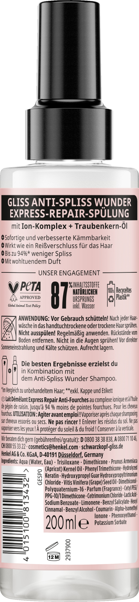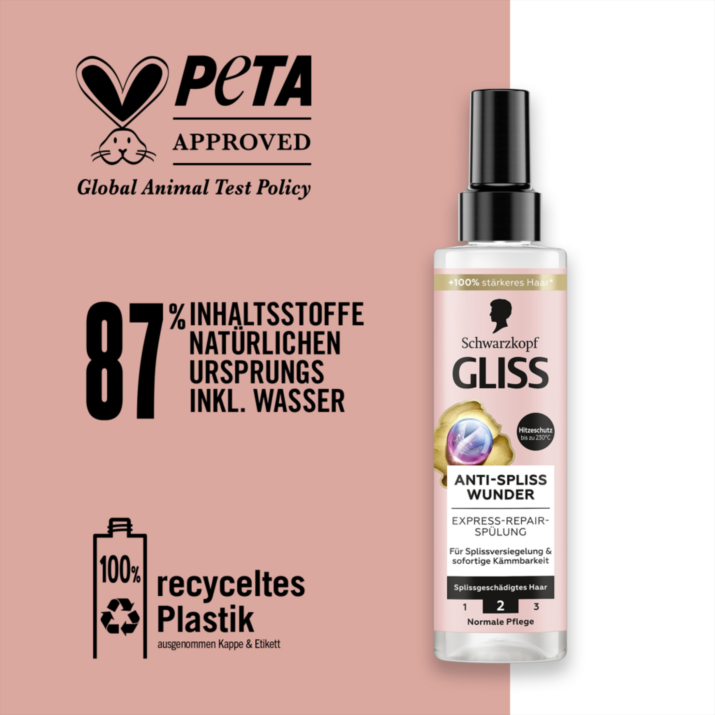 Keine Lust mehr auf Spliss und häufiges Spitzen schneiden? Versiegle Spliss langanhaltend! Mit Ion-Komplex und Traubenkern-Öl gleicht die Gliss Spülung Unebenheiten in der Haarstruktur vom Ansatz bis in die Spitzen aus. Sie versiegelt Spliss langanhaltend für bis zu 94 % weniger Spliss¹ - für ein starkes und gesundes Haargefühl. So wird das Haar fühlbar geschmeidig und erhält einen natürlichen Glanz. Ebenso bietet das Gliss Anti-Spliss Wunder Hitzeschutz bis 230 °C. Die Pflegespülung besteht zu 87 % aus Inhaltsstoffen natürlichen Ursprungs². Die Spülung ist von PETA³ zertifiziert und der Flaschenkörper besteht aus 100 % recyceltem Kunststoff⁴.