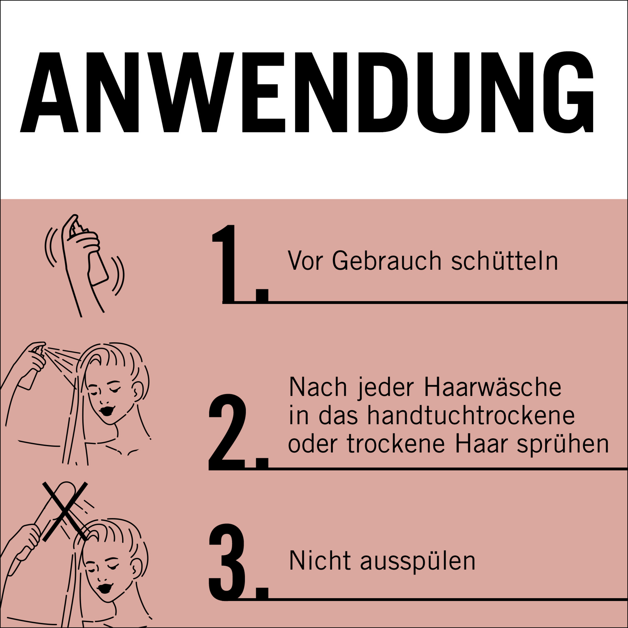 Vor Gebrauch schütteln! Nach jeder Haarwäsche in das handtuchtrockene oder trockene Haar sprühen. Nicht ausspülen! Regelmäßig anwenden.